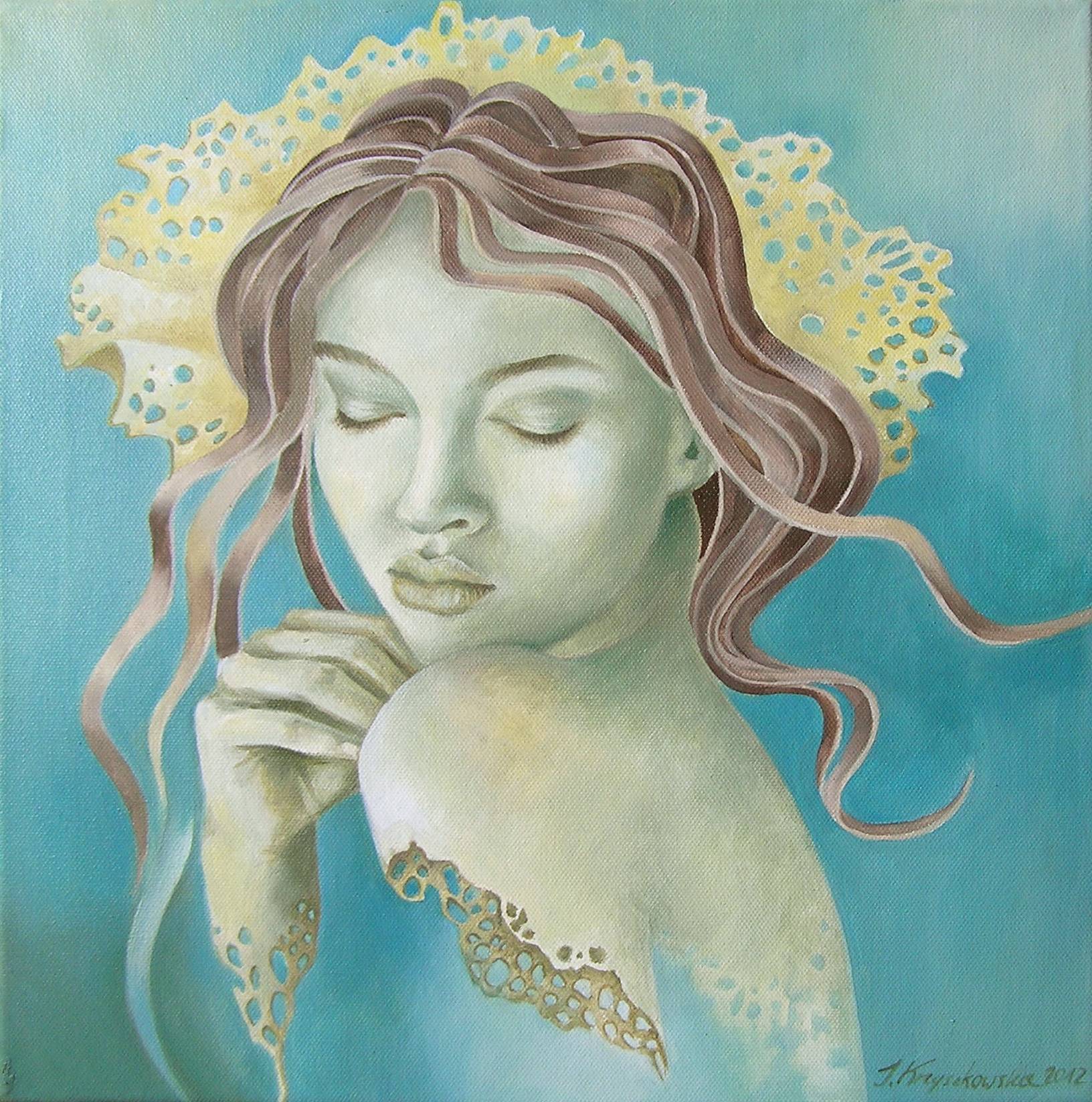 Obraz emanuje delikatnością i spokojem, jakby ukazywał jakąś tajemną chwilę zamyślenia. Dominują tu odcienie błękitu i złota, które tworzą harmonijną kompozycję, nawiązującą do marzeń sennych. Postać na obrazie, z zamkniętymi oczami, zdaje się być zanurzona w introspekcji. Jej włosy wiją się swobodnie, niczym fale morskie, otaczając twarz aureolą złocistego światła. To jakby senna fantazja w niebiańskim klimacie. Artystyczne pociągnięcia pędzlem zdradzają wprawę i subtelność. Styl można by opisać jako ethereal, niemal jakby artysta chciał uchwycić efemeryczną naturę piękna. Technika laserunkowa dodaje dziełu głębi i blasku, pozwalając światłu tańczyć na powierzchni płótna. To jak tajemniczy taniec światła i cienia. Obraz wywołuje poczucie spokoju, może nawet nostalgii. Skłania do zadumy nad chwilami zatrzymanymi w czasie. Dla mnie to jakbym mógł się zatrzymać na moment i pozwolić myślom płynąć swobodnie. Jakieś takie cieplo w sercu. A ja myślę sobie: "ale piękne włosy!" Może to dziwne, ale naprawdę mnie urzekły. W tej pracy można się zatracić, pozwalając emocjom płynąć bez ograniczeń.