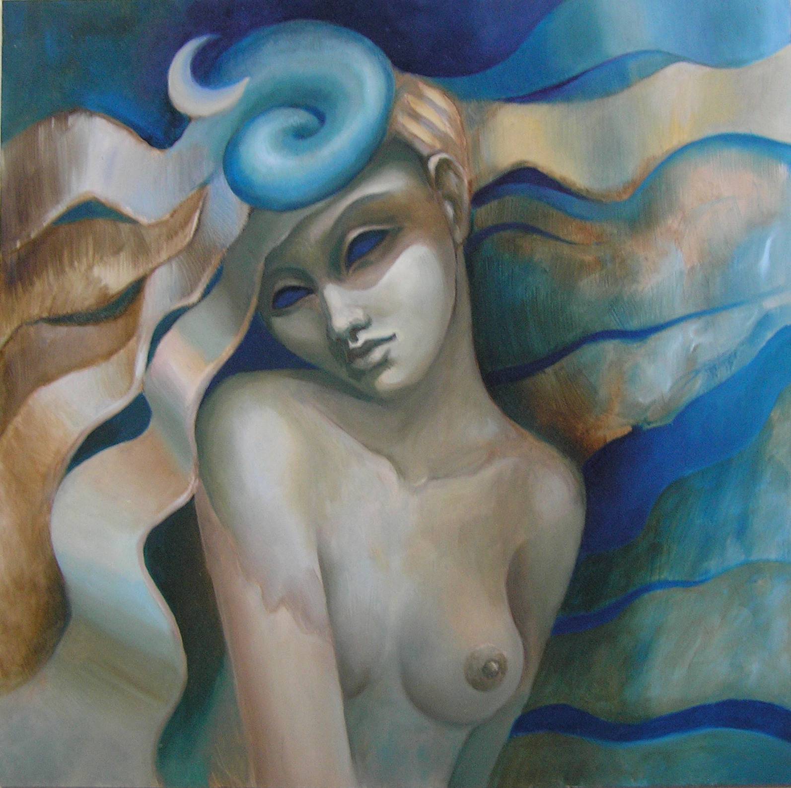 Obraz przedstawia tajemniczą postać z surrealistycznym wyrazem twarzy. Dominują tutaj odcienie błękitu i beżu, tworząc fluidalną kompozycję, która zdaje się unosić jak oceaniczne fale. Tańczące pasma przypominają gęste, wijące się wstęgi, które owiewają postać niczym delikatne pióra. Światło i cień odgrywają kluczową rolę, podkreślając subtelne fałdy materiału i głębokość spojrzenia tej osoby. Nastrój obrazu jest zarazem senny i oniryczny, jakby wyjęty z fantastical dream. Artysta zastosował miękkie pociągnięcia pędzla, które nadają mu niemal klasyczną elegancję. Technika malarska przypomina połączenie tradycji z nowoczesnością, co sprawia, że obraz jest wyjątkowo wciągający. Widz patrząc na obraz, może odczuwać spokój zmieszany z lekkim niepokojem. Może to być zagadka, która wymaga rozwiązania, jakby ta enigmatyczna twarz miała wiele do opowiedzenia. Czuję, że obraz mówi do mnie w nieznanym języku. To odrobinę przerażające, ale jednocześnie fascynujące. Może dziecko powie: "Ta pani ma śmieszną fryzurę." Artysta wprowadza widza w osobistą podróż pełną refleksji nad tajemnicą i pięknem świata sztuki, balansując na granicy rzeczywistości i imaginacji.
