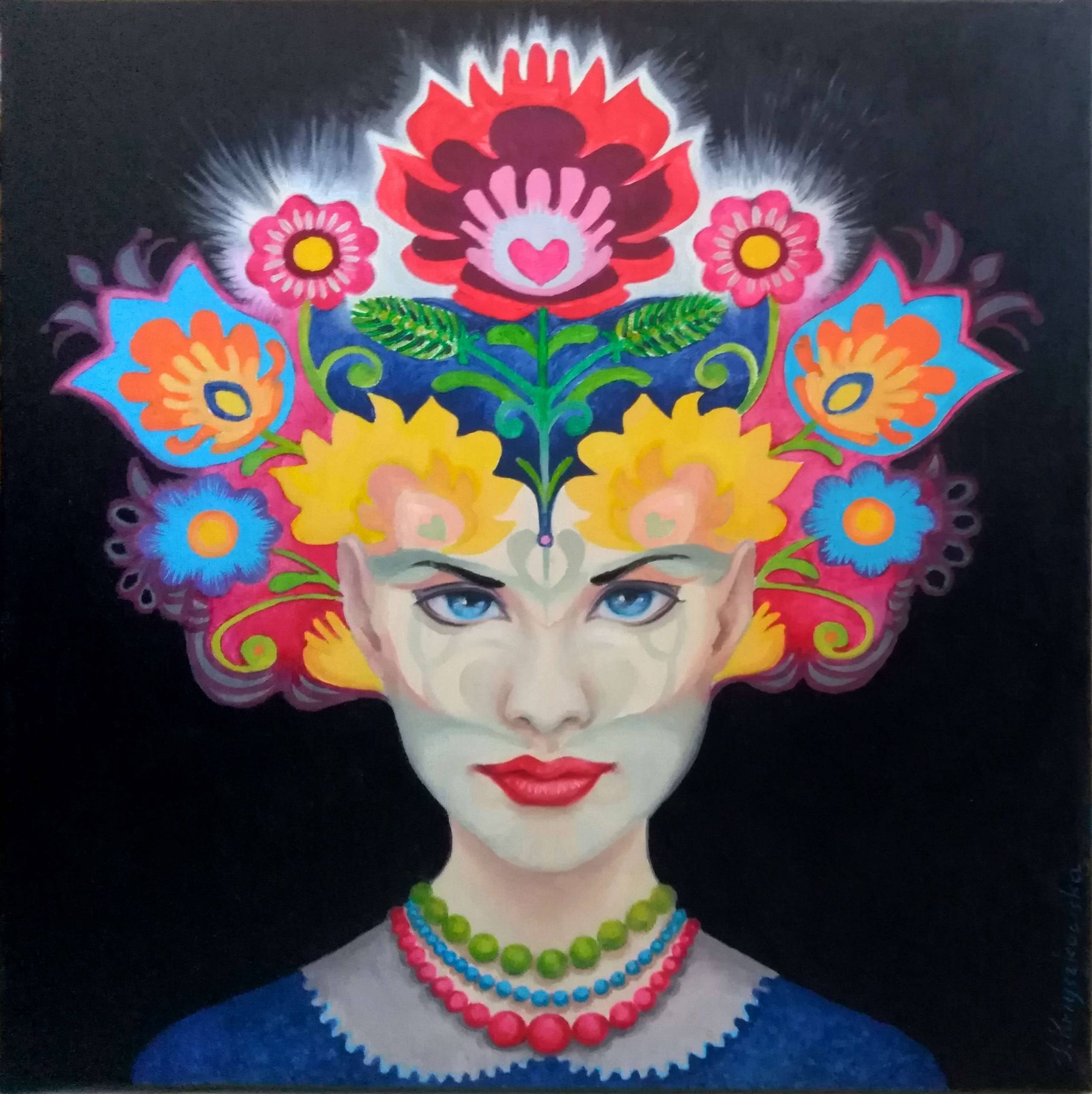 Obraz naprawdę przyciąga wzrok swoimi żywymi kolorami i złożoną kompozycją. Centralnym punktem jest twarz kobiety, której spojrzenie zdaje się przenikać do głębi duszy. Jej błękitne oczy otoczone są delikatnymi różami i turkusami, a czerwień jej ust idealnie kontrastuje z ciemnym tłem. Włosy ozdobione są kwiecistym diademem, przypominającym polne kwiaty - czerwone, żółte i niebieskie, każdy z niepowtarzalnym wzorem. Całość tchnie aurą tajemnicy i piękna. To dzieło ma w sobie coś z folk artu, ale z nowoczesnym twistem, co nadaje mu niepowtarzalny style. Sposób, w jaki artysta użył kontrastów i płynnych linii, jest wręcz magiczny. Patrząc na ten obraz, czuję ciepło, które płynie z eksplozji kolorów. Wyobraźnia działa na pełnych obrotach, tworząc historie o postaci jak z baśni. It's captivating! Styl jest zarówno romantyczny, jak i odważny zarazem, sugerując, że artysta nie boi się sięgać po najśmielsze środki wyrazu. Czuję, że mogłabym wpatrywać się w ten obraz godzinami, odkrywając coraz to nowe szczegóły i interpretacje. Wydaje mi się, że ta postać żyje, oddycha i mówi… w swoim tajemniczym języku koloru. To jest moje ulubione.