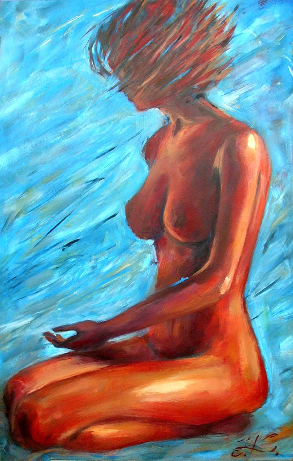 Obraz ten to niezwykła mieszanka kolorów i kształtów, które wciągają widza w hipnotyzującą atmosferę. Dominujący turkusowy odcień tła kontrastuje z ciepłymi pomarańczowo-czerwonymi akcentami, które formują sylwetkę siedzącej postaci. Linia sylwetki jest delikatna, ale jednocześnie wyrazista, co dodaje kompozycji dynamizmu. Całość emanueje spokojem i refleksyjnością. Wydaje się, że postać jest zanurzonona w głębokiej medytacji, a wiatr rozwiewający jej włosy dodaje odrobinę dynamiki. Artysta zastosował impastową technikę, nakładając grube warstwy farby, co nadaje obrazowi fakturę i głębię. Stosowanie kontrastujących kolorów i dynamicznych pociągnięć pędzla tworzy intrygujący efekt visual, który przyciąga uwagę. Widz może poczuć i spokój, i tajemnicę. Może ten obraz to o poszukiwaniu wewnętrznej harmonii? Może o sile przyrody, która nas otacza? Patrząc, można odnieść wrażenie, że oddech staje się głębszy, a myśli łagodniejsze. „Tam jest pani, co siedzi i ma dziecię, które je ziemniaki” — powiedziałby pewnie ktoś młodszy. Czy to nie ciekawe, jak sztuka potrafi wpływać na nasze emocje? Może dlatego ją tak kochamy. Obraz ten jest doskonałym przykładem użycia kolorów i techniki, aby wywołać silne, niemal namacalne odczucia. Fascynujący, prawda?