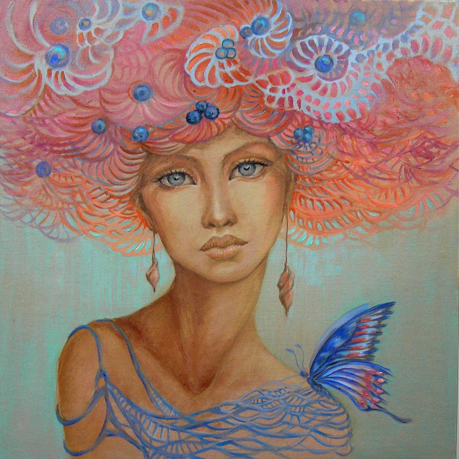 Na obrazie widzimy tajemniczą postać o intensywnym spojrzeniu, której włosy przypominają kwieciste, różowo-niebieskie fale. To trochę jak tkanie marzeń, gdzie kolor nabiera życia i płynie jak rzeka. Całość ma kompozycję pełną harmonii, miękkie linie i delikatne przejścia barw. Jest jak połączenie surrealizmu i magii. Nastrój obrazu wydaje się być spokojny, a jednocześnie pełen niespodziewanej energii. Uczucie tajemnicy jest niemal namacalne, jakby coś miało się wydarzyć poza kadrem. Artysta zastosował ciekawą technikę mieszania farb, przez co obrazy wibrują żywymi kolorami. To jakby pędzel tworzył melodię na płótnie. Detale są precyzyjnie zarysowane, co dodaje całości realności mimo abstrakcyjnych elementów. A tam, na ramieniu, siedzi kolorowy motyl, który wydaje się szeptać sekrety świata. Obraz może budzić w widzu poczucie tęsknoty za baśniowym światem, jakbyśmy na chwilę przenieśli się gdzieś indziej. Może też wywoływać refleksje o kobiecej sile i delikatności. Wow, look at those colors! I tak sobie myślę, że można by usiąść i patrzeć godzinami, bo za każdym razem odkrywamy coś nowego. To takie piękne, jest jak opowieść bez słów. A gdyby tak móc wejść do tego świata? Ciekawe, co by nas tam spotkało. Może zupełnie coś niespodziewanego?