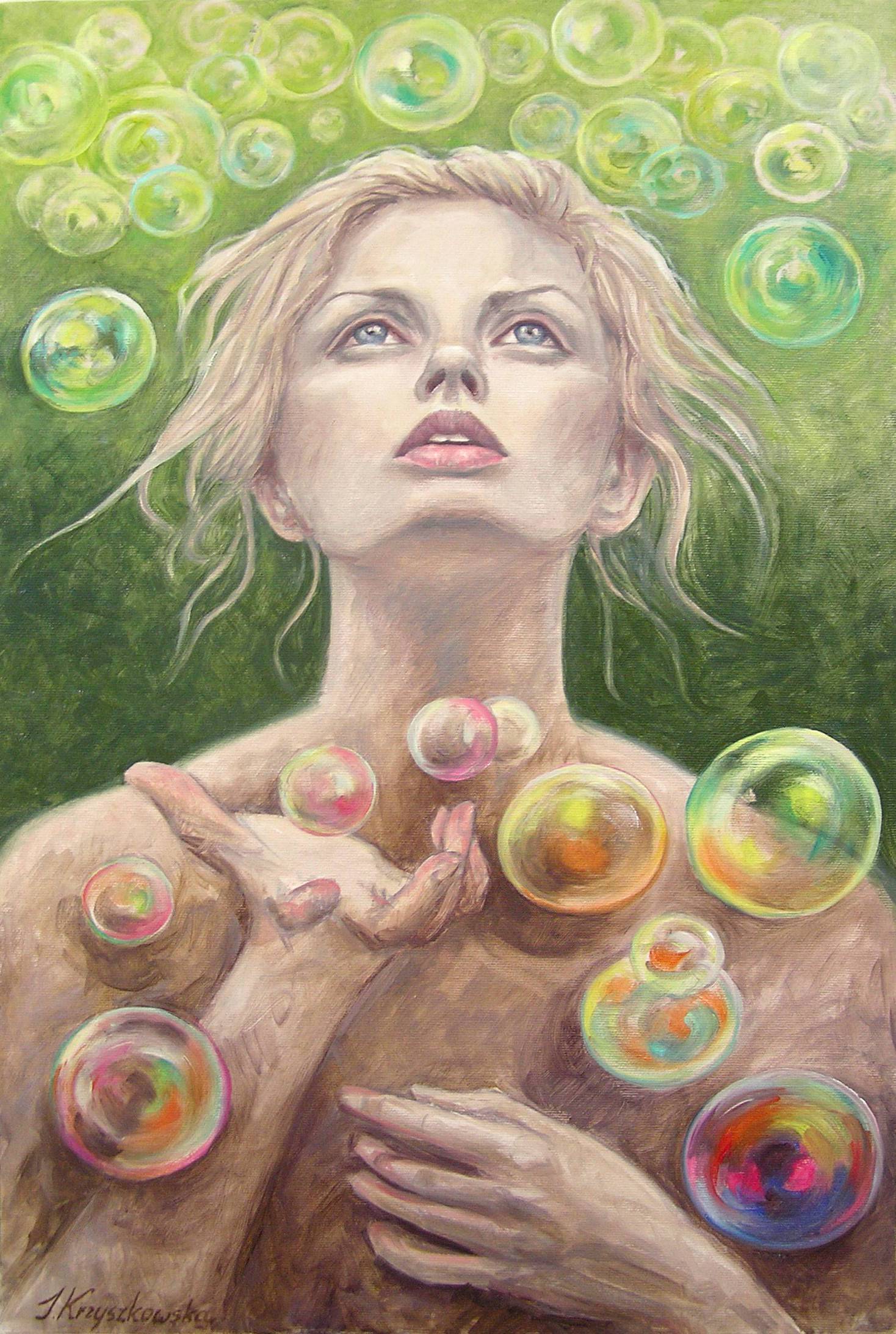 Obraz emanuje eterycznym pięknem, przedstawiając postać w otoczeniu fantazyjnych baniek mydlanych. Dominują tu miękkie, delikatne odcienie zieleni i beżu, które tworzą harmonijną kompozycję. Bańki unoszą się wokół kobiety, jakby tańczyły w powietrzu, odbijając subtelne przebłyski tęczy. Kształty są łagodne, a każda bańka lśni refleksami kolorowego światła. Atmosfera obrazu jest niemal marzycielska, pełna nostalgii i niewinności. Styl przypomina impresjonizm, z delikatnymi pociągnięciami pędzla, które dodają wrażenia ruchu i lekkości. Obraz może wywoływać emocje związane z dzieciństwem i beztroskimi chwilami. Czujemy się jakbyśmy mogli dotknąć tych baniek—może z czasów, gdy biegaliśmy po ogródku, chichocząc na widok balonów przemykających nam nad głową. Wow, takie fajne bańki! Technika artysty podkreśla ulotność momentu, dając wrażenie, że czas na chwilę się zatrzymał. Jest coś magicznego, almost mystical, w sposobie, w jaki uchwycono światło i ruch. Obraz skłania do refleksji nad chwilami, które są ulotne, ale pozostawiają trwałe ślady w naszej pamięci. To jak spojrzenie przez kalejdoskop, gdzie każdy element ma swoje miejsce, tworząc jednocześnie coś większego, co nas porusza. Naprawdę wyjątkowe uczucie.