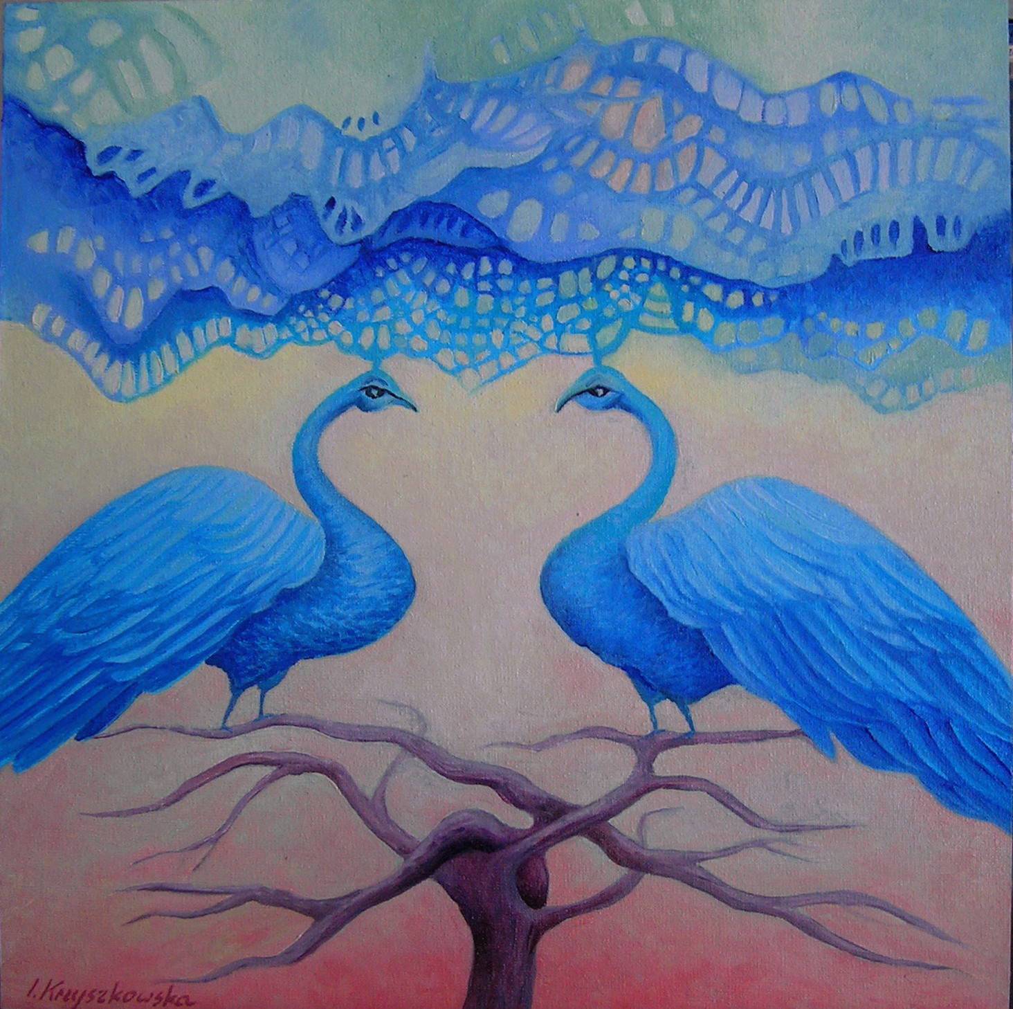 Obraz przedstawia dwa niebieskie pawie siedzące na gałęziach drzewa, którego konary łączą się jak skomplikowana sieć. Ich pióra są jak aksamitne, świetliste płaszcze, które kontrastują z cielistym tłem i delikatną koronką na niebie. Całość emanuje spokojem i harmonią. Paleta barw jest bogata, dominuje chłodny błękit i subtelne pastelowe odcienia zachodzącego słońca. Atmosfera obrazu jest oniryczna, jak z bajki. Dzięki finezyjnej grze światła i cienia artysta tworzy magiczny nastrój. Technika malarska wydaje się lekka, jakby pędzel ledwo dotykał płótna. Zastosowana kompozycja sprawia, że wzrok wędruje od jednego pawi do drugiego, tworząc iluzję dialogu między nimi. Patrząc na to dzieło, można poczuć intrygującą mieszaninę nostalgii i zadumy. Pawie zdają się symbolizować elegancję i tajemniczość natury. Dzieciak by powiedział: "Pawie są jak z jakiejś bajki!". I nie sposób się z tym nie zgodzić. Obraz budzi uczucia spokoju, ale też pobudza wyobraźnię, zachęcając do prywatnych interpretacji. It’s like stepping into a dream.