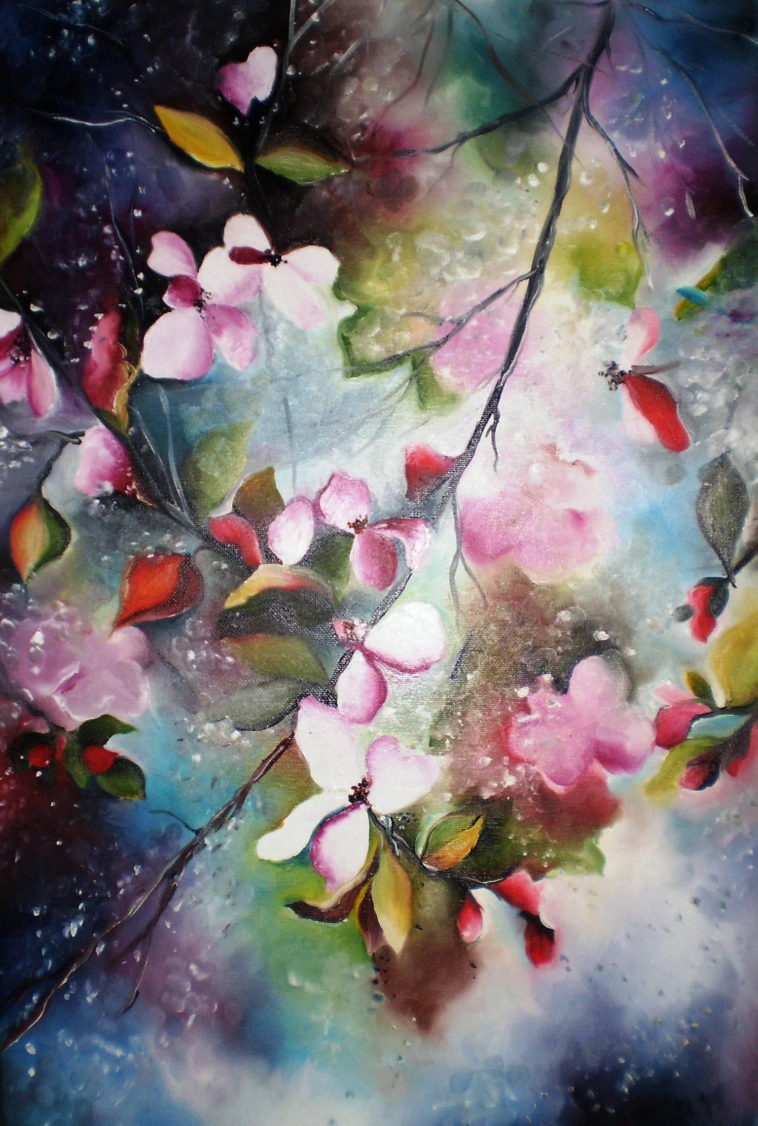 Obraz urzeka paletą barw, od delikatnych pasteli po intensywne czerwienie i błękity. Pastelowe różowe kwiaty, rozrzucone na tle zamglonego, eterycznego krajobrazu, tworzą kompozycję pełną gracji i spokoju. Gałązki i liście przeplatają się, tworząc naturalną ramę dla tej subtelnej symfonii kolorów. Kształty są nieregularne, ale harmonijne, co nadaje dziełu lekkość i fluidność. Atmosfera tego obrazu jest niczym wczesnowiosenna poranna mgiełka, tajemnicza i kusząca. Obraz emanuje delikatnym, niemal sennym nastrojem, jakby zapraszał widza do wejścia w świat marzeń. Artysta używa technik impresjonistycznych, delikatnych pociągnięć pędzla, które nadają kompozycji dynamikę i głębię. To dzieło budzi różne emocje. Dla mnie to jak spacer po magicznym ogrodzie, pełnym ukrytych tajemnic. Dzieciak by powiedział: "Te kwiatki wyglądają jak na bajkowej łące!" W tle czuć niemal dotyk wiosennego powietrza. Ten obraz jest po prostu magical, przywołując uczucie spokoju i radości. Każdy widz może odnaleźć w nim coś innego, od harmonii do nostalgii, a nawet tęsknoty za odległymi krainami.