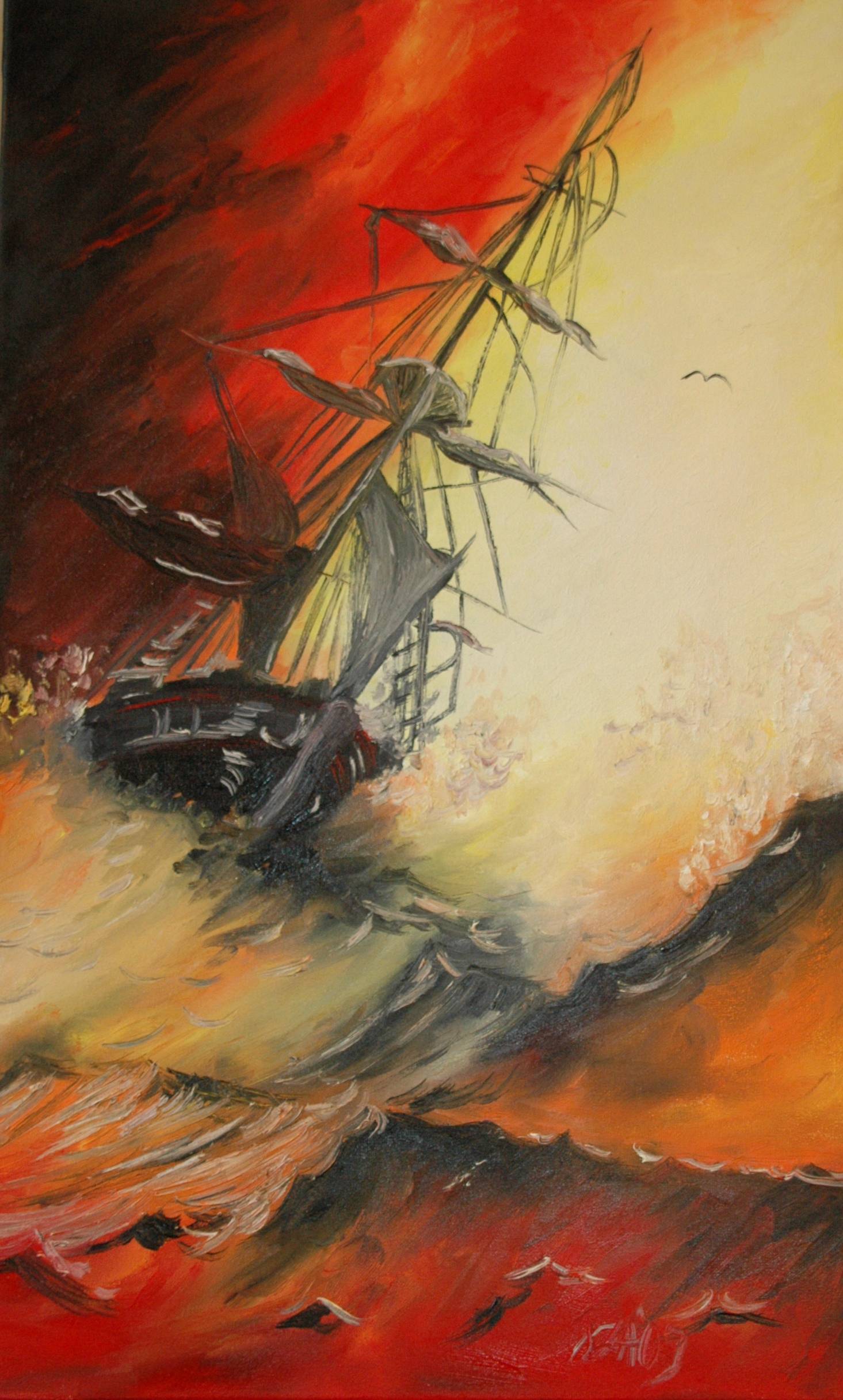 Obraz przedstawia dramatyczną scenę zatopioną w intensywnych, ognistych barwach czerwieni i pomarańczu, przełamanych dynamicznymi plamami żółci i ciemnego granatu. Na pierwszym planie widoczny jest zmagający się z falami statek, którego maszt wygina się pod siłą wiatru. Fale wydają się niemal pochłaniać żaglowiec, tworząc chaos i napięcie. To jak rollercoaster emocji zamknięty w tej wirującej masie kolorów. Styl obrazu można by nazwać ekspresjonistycznym, z mocno zarysowanymi pociągnięciami pędzla, które dodają dziełu energii i dynamiki. Wygląda jakby artysta malował z pełnym zaangażowaniem, niemal w transie, pozwalając emocjom kierować jego ręką. Cała scena emanuje poczuciem burzy i walki z żywiołem. Widok przypomina, że natura bywa nieprzewidywalna i potrafi nas zaskoczyć w najmniej oczekiwanym momencie. Można niemal usłyszeć huk fal i szum wiatru przy takim obrazie, czując na sobie morską bryzę. Płótno zdaje się opowiadać historię walki człowieka z potężnymi siłami przyrody. Wow, wygląda jak scena z prawdziwej przygody, gdzie ryzyko miesza się z ekscytacją. Widz patrzący na ten obraz może poczuć zarówno grozę, jak i piękno niesamowitej potęgi naturalnych sił. Obraz można by opisać jako "breathtaking", bo naprawdę odbiera dech. Uważny obserwator dostrzeże determinację załogi, może odnajdzie w tym symbol ludzkiej wytrwałości i odwagi. Takie dzieło skłania do refleksji nad naszym miejscem w świecie i tym, jak często musimy mierzyć się z jego nieokiełznanym charakterem.