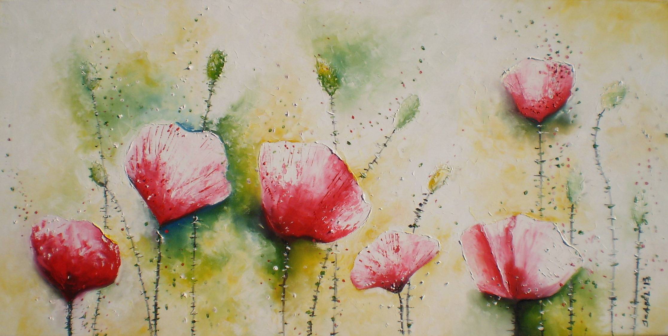 Obraz emanuje subtelną delikatnością za sprawą pastelowych kolorów i płynnych kształtów kwiatów maków. Dominują tu odcienie czerwieni i różu, które kontrastują z miękkimi żółciami i zieleniami, tworząc harmonię pełną spokoju. Kompozycja jest prosta, ale zarazem efektowna, prowadząc oko od jednego płatka do drugiego, jakby w tanecznym rytmie. Atmosfera dzieła jest sielankowa i odrobinę nostalgiczna, jakby przywoływała wspomnienia letnich dni spędzonych na łące. Styl artystyczny charakteryzuje się lekkością i pewnym stopniem abstrakcji. Artysta nie boi się użyć impasto, co dodaje tekstury i głębi kompozycji, jakby można było poczuć fakturę płatków pod palcami. To taki artystyczny "touch", który sprawia, że obraz żyje. Widz może poczuć radość i spokoj, ale też ulotność chwili. Czy te maki zaraz przekwitną? Tak kolorowe i piękne, a jednak efemeryczne. Dla mnie – refleksja o naturalnym cyklu życia. Wow! – to mogłoby powiedzieć dziecko, zachwycone barwami. Emocje wzbudzone przez obraz mogą być różnorodne: od radości i zafascynowania po lekki smutek związany z przemijalnością.