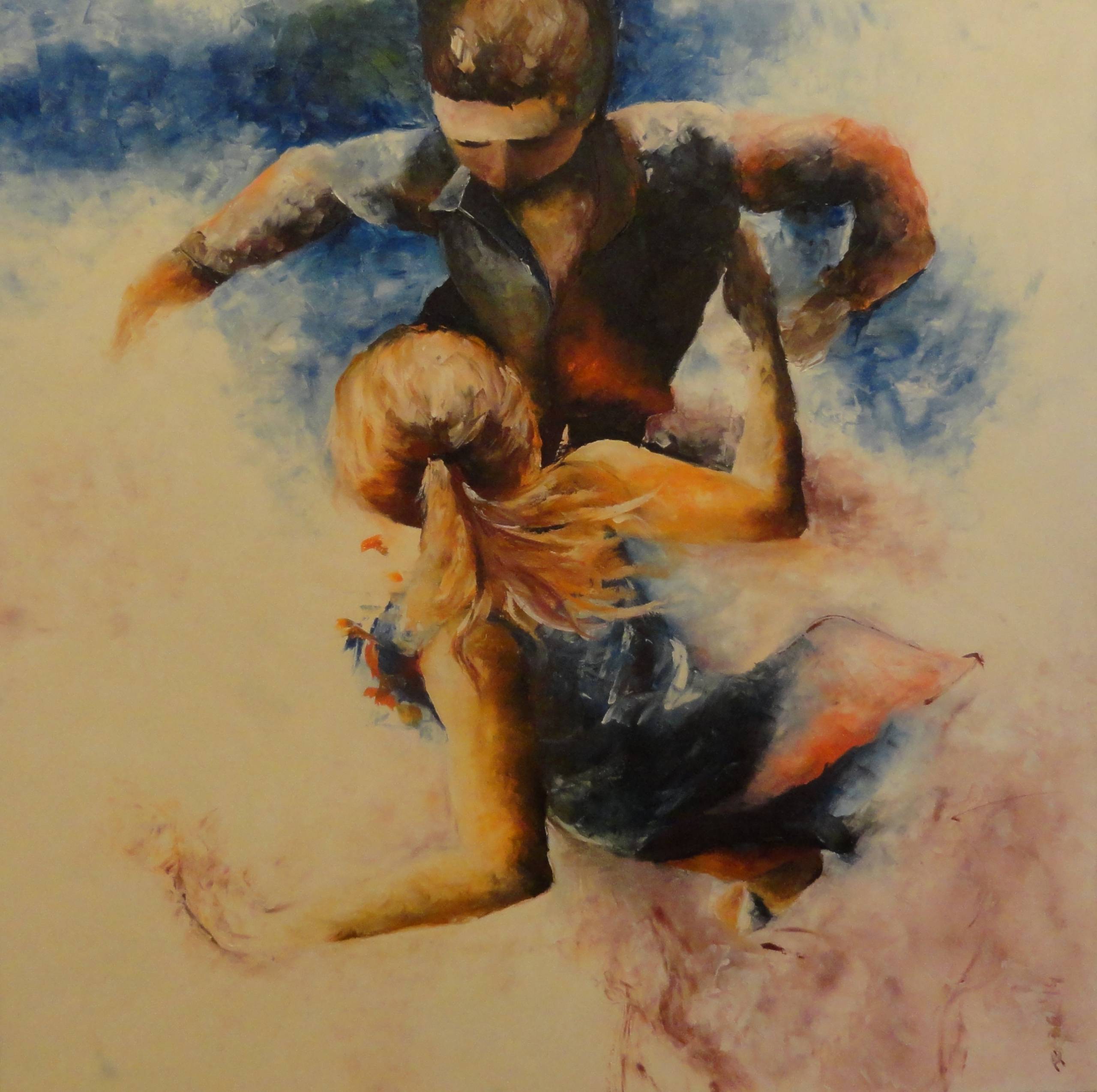 Na obrazie widzimy dynamiczną parę, której sylwetki zdają się niemal unosić w ruchu. Kolory są żywe, dominują głównie odcienie niebieskiego i czerwonego zmieszane z ciepłymi tonami skóry bohaterów. Kształty są miękkie, co nadaje całości lekko abstrakcyjny charakter. Atmosfera jest pełna energii - czuć w niej rytm tańca i spontaniczność chwili. Artysta stosuje technikę impastu, co widać w grubo kładzionej farbie, przez co postacie wydają się niemal wychodzić z płótna. Malarskie "brushstrokes" dodają obrazowi ruchu. Oglądając to dzieło, można poczuć ekscytację i radość, jakbyśmy sami tańczyli. Dłonie tej tańczącej pary są złączone w pięknym porozumieniu, które może wzbudzać w widzu poczucie bliskości i harmonii. To jest jak magię widzieć. Dziecko powiedziałoby: "Oni się chyba bawią w chowanego na poziomie mistrza!". Obraz przypomina mi chwile, kiedy sam tańczyłem z przyjacielem przy muzyce w salonie. To dzieło jest celebracją ruchu i emocji, a jego siła tkwi w umiejętności uchwycenia najkrótszej chwili, tak aby stała się wiecznością.