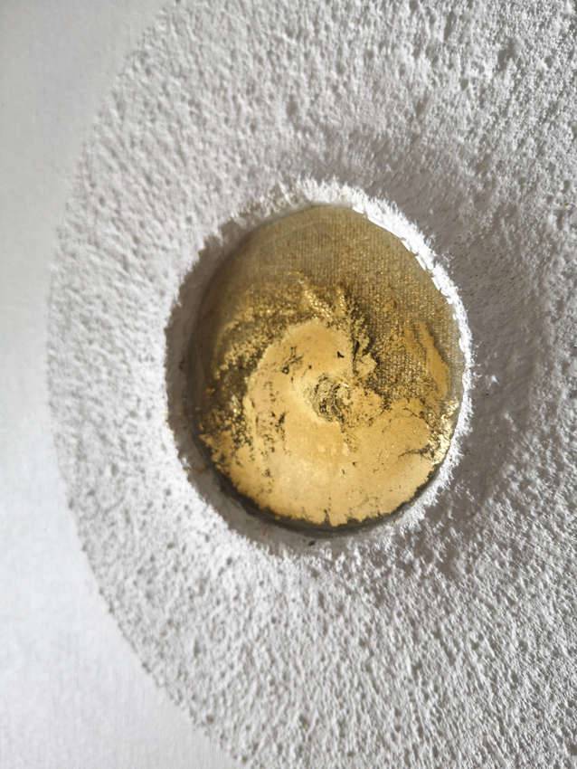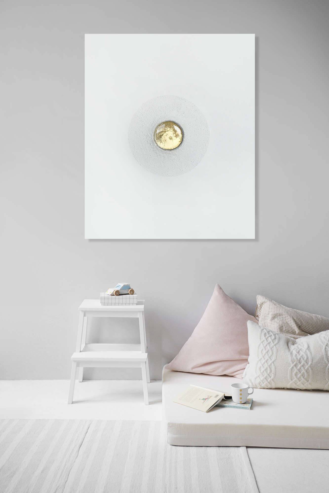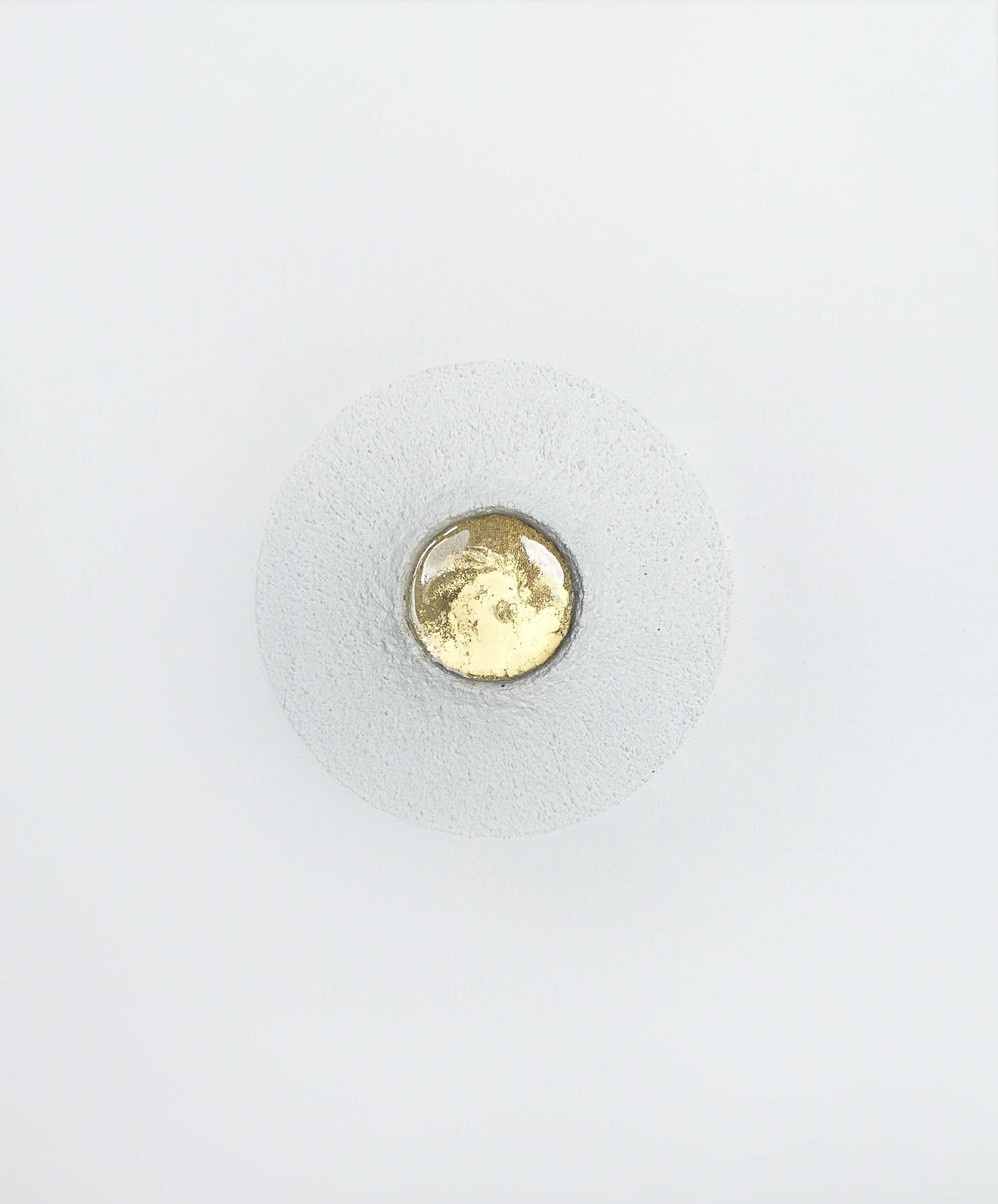 50x40 cm akryl, żywica epoksydowa i relief na płótnie 2019 Obraz wykonany moją własną autorską technika, którą zaczęłam malować już na studiach. Użyłam też żywicy epoksydowej i farb akrylowych. "Feniks" to niezwykle oryginalny obraz, niepowtarzalny, nie dający się skopiować - w procesie tworzenia istotną role odegrał przypadek. Powierzchnia obrazu jest biała, nierówna, wspaniale zmienia się wraz z porami dnia oraz typem oświetlenia prezentując szeroką gamę szarości i beżu w zależności od wnętrza, w którym wisi. Wtapia się w nie znakomicie tworząc integralną całość. Dominantą jest reliefowe koło tworzące wypukły krater w którego środku jest niczym lawa zastygła przezroczysta żywica (kilka milimetrów grubości). Na jej powierzchni widać złocenia przywodzące na myśl mistycznego Feniksa. Obraz nada wnętrzu elegancji, ale także aury mistycyzmu. W proces jego powstawania zaangażowane było wszystkie cztery żywioły oraz przypadek, który uformował kształt Feniksa.