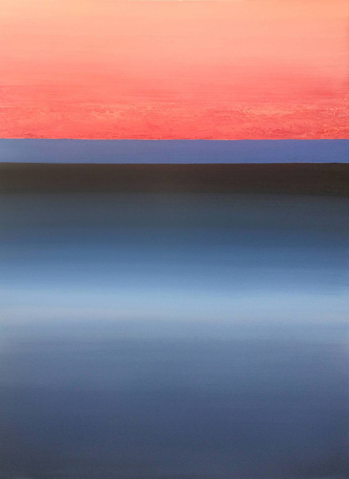 Pejzaż abstrakcyjny inspirowany widokiem w Norwegii. Zachodzące słońce i chmury spowijające fiordy. Boki obrazu zamalowane na biało.