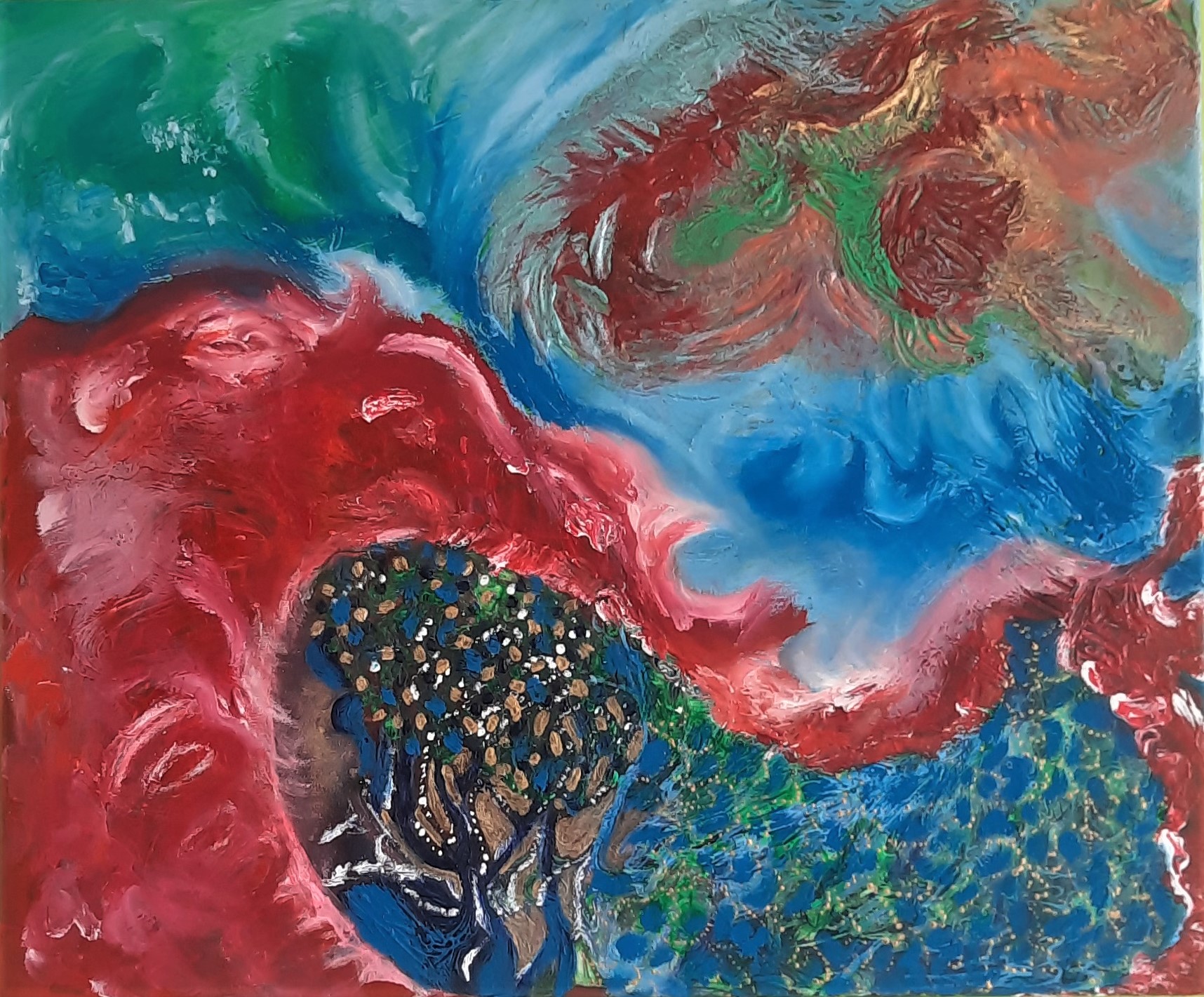 Obraz tętni kolorami. Dominują czerwony, zielony i niebieski, jakby artysta zanurzył pędzel w czystej tęczy. Kształty są tu płynne, falujące, może trochę zamazane niczym baśniowe chmury. Kompozycja wydaje się chaotyczna, ale właśnie w tym tkwi jej magiczny urok. Obraz emanuje energią, która przyciąga wzrok i intryguje. Człowiek mógłby patrzeć i patrzeć i wciąż odkrywać coś nowego. Jest tu coś z surrealizmu, a może impresjonizmu, jak u takiego sławnego artysty co malował ogród. Technika artystyczna to prawdopodobnie impast, co dodaje tekstury, a efekty są wow! Emocje? Może być spokój, fascynacja, a nawet lekkie zamyślenie. Wyobraźnia pracuje na pełnych obrotach. Nastrój buzuje między radością, a tajemnicą. Coś jak adventurous dream. A co, gdyby zapytać dziecko co widzi? "Cały świat z kolorów i drzewko, które rośnie na chmurce!". Osobiście, byłem zachwycony – jakby czas się zatrzymał. To obraz, który żyje, oddycha samym sobą. Trudno się oderwać, prawda?