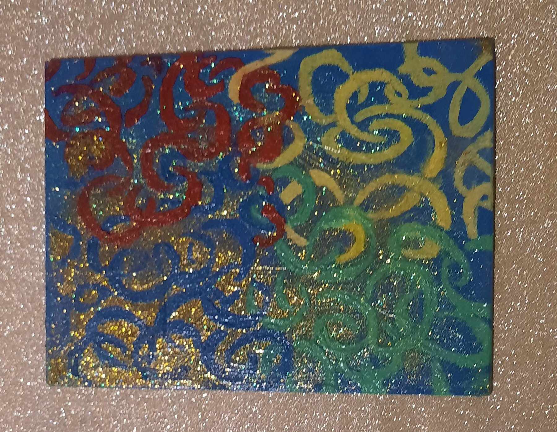 Obrazek emanuje energią i żywiołowością pełną kolorów. Dominują intensywne odcienie niebieskiego, zieleni i czerwieni, które wirują na płótnie w postaci zakręconych i krętych linii. Tе motywy przywołują na myśl tętniące życiem fale lub splątane węzły, które zdają się żyć własnym życiem. Pomyślałam, że to jakby magia nałożona na płótno. Prawda jest taka, że ten obraz aż kipi od energii. Artysta zastosował technikę, która przypomina mi trochę dziecięce bazgroły, jednak z precyzją, która tka zarysowaną kompozycję. Mechanizm tworzenia wzorów jest jak taniec pędzla po płótnie, z którego emanuje pewien swoisty chaos, ale i równowaga. Hmm, czy to możliwe? Choć na pierwszy rzut oka wszystko wydaje się przypadkowe, szybko zauważamy, że jest w tym głęboki zamysł. Obraz napawa optymizmem, jego błyszczące elementy dodają lekkości i fantastyczności. To jakby patrzeć na świat widziany oczami dziecka, pełen czarów i niespodzianek. Widz czuje się zaintrygowany, zaczyna zastanawiać się nad znaczeniem tych wijących się form. Każdy z nas może zobaczyć coś innego, co jest fajne. Fascynujące jest to, jak artysta manipuluje przestrzenią i kolorem, by wywołać emocje - od radości po nostalgiczną zadumę. A te migoczące, glitter-like detale sprawiają, że całość przyciąga wzrok jak magnes.