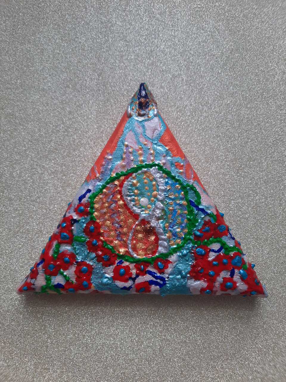 Trójkątny kształt obrazu natychmiast przyciąga wzrok swoją oryginalnością. Kolory tętnią życiem, na czoło wysuwa się intensywna czerwień, przełamana zielenią i błękitem. Centralny, zaokrąglony wzór zdaje się symbolizować nieskończoność lub harmonię życia, a użycie delikatnych punktów dodaje mu trójwymiarowości. W tle zauważyć można subtelną, perłową fakturę, która przywodzi na myśl calmness. Wygląda jak coś z magicznej baśni, prawie jak malowidła dziecka, gdzie wyobraźnia nie zna granic. Technika zastosowana przez artystę to połączenie pociągnięć pędzla z fakturowymi dodatkami, które nadają głębi i unikalności. Atmosfera obrazu jest niemal mistyczna, jakby skrywała tajemnicę. Może wywoływać uczucie zaciekawienia lub nawet spokoju u odbiorcy. Myślę, że dla mnie to jak podróż do innej rzeczywistości, gdzie wszystko jest możliwe. Kiedy dziecko patrzy na to, mogłoby powiedzieć: "To dom dla małych skrzatów!". Czy to jest sztuka nowoczesna? Trudno powiedzieć, ale na pewno kreatywna. Takie małe dzieło sztuki zmusza do refleksji nad nieskończonością i uporządkowanym chaosem otaczającego nas świata. Kto wie, może właśnie w tym tkwi jego siła. Obraz pobudza wyobraźnię i zachęca do snucia własnych opowieści o nim.