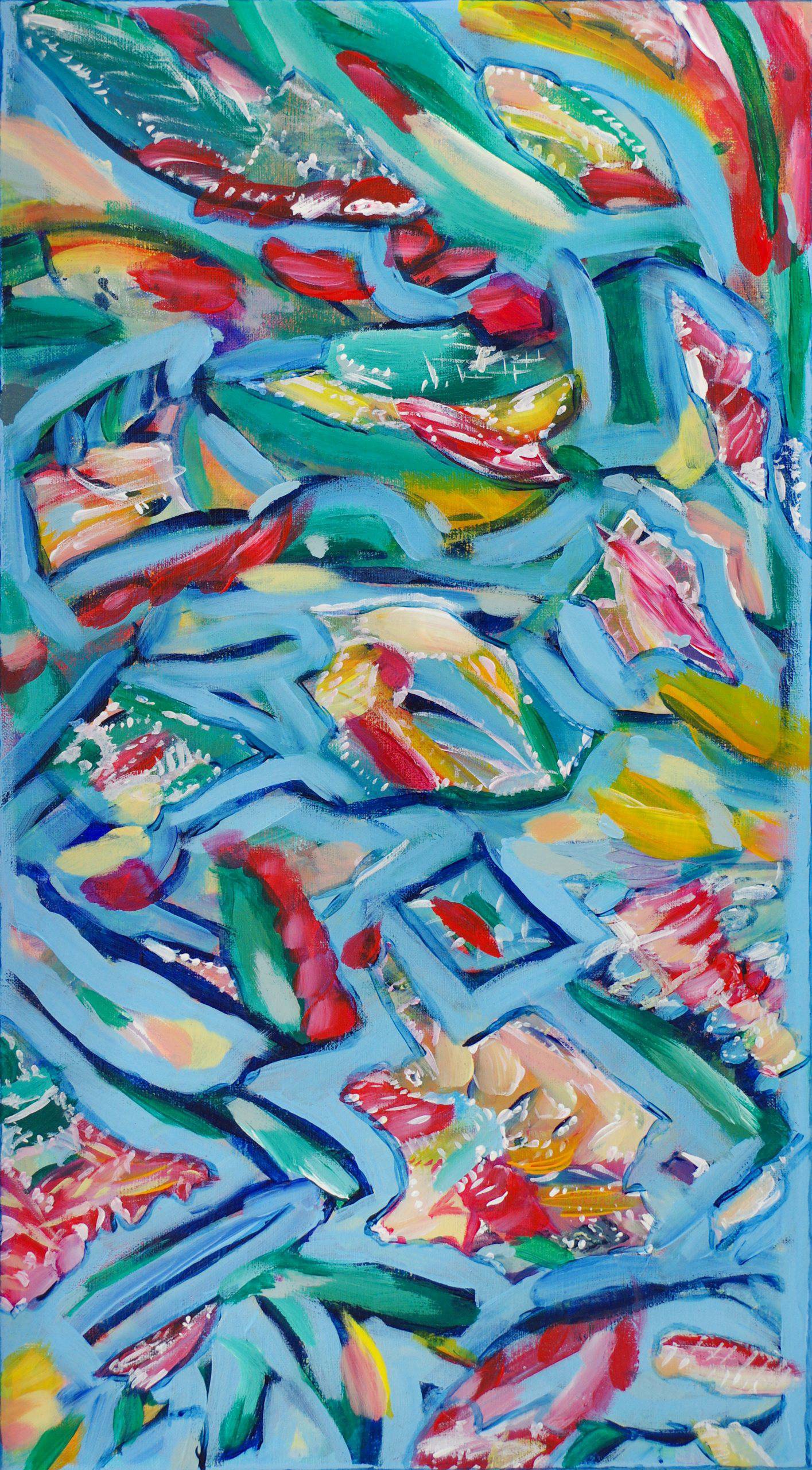 Na obrazie widzimy feerię barw: intensywne czerwienie, zieleni i niebieskie odcienie tworzą dynamiczny taniec na płótnie. Kształty przypominają nieco liście, a może nawet ryby? Trudno powiedzieć. Chłodne odcienie błękitu splatają się z ciepłymi akcentami, jakby artysta próbował złapać równowagę między spokojem a energią. To, co od razu rzuca się w oczy, to nieformalny styl malarstwa. Artysta użył grubych pociągnięć pędzlem i tekstury farby. Obraz emanuje żywiołowością, jakby chciał nam powiedzieć "hey, patrz na mnie!". Mimo wielu kolorów i kształtów, wszystko tu do siebie pasuje. Jak układanka. Obraz wzbudza ciekawość. Czy to morze pełne tajemniczych stworzeń, a może zupełnie abstrakcyjny pejzaż? Można sobie wyobrazić dziecięce zachwyty. "To wygląda jak wielka kolorowa tęcza!". Artysta stworzył kompozycję, która pobudza wyobraźnię. Gdy patrzę na ten obraz, czuję nutę ekscytacji, jakbym odkrywał coś nowego. To takie captivating art.