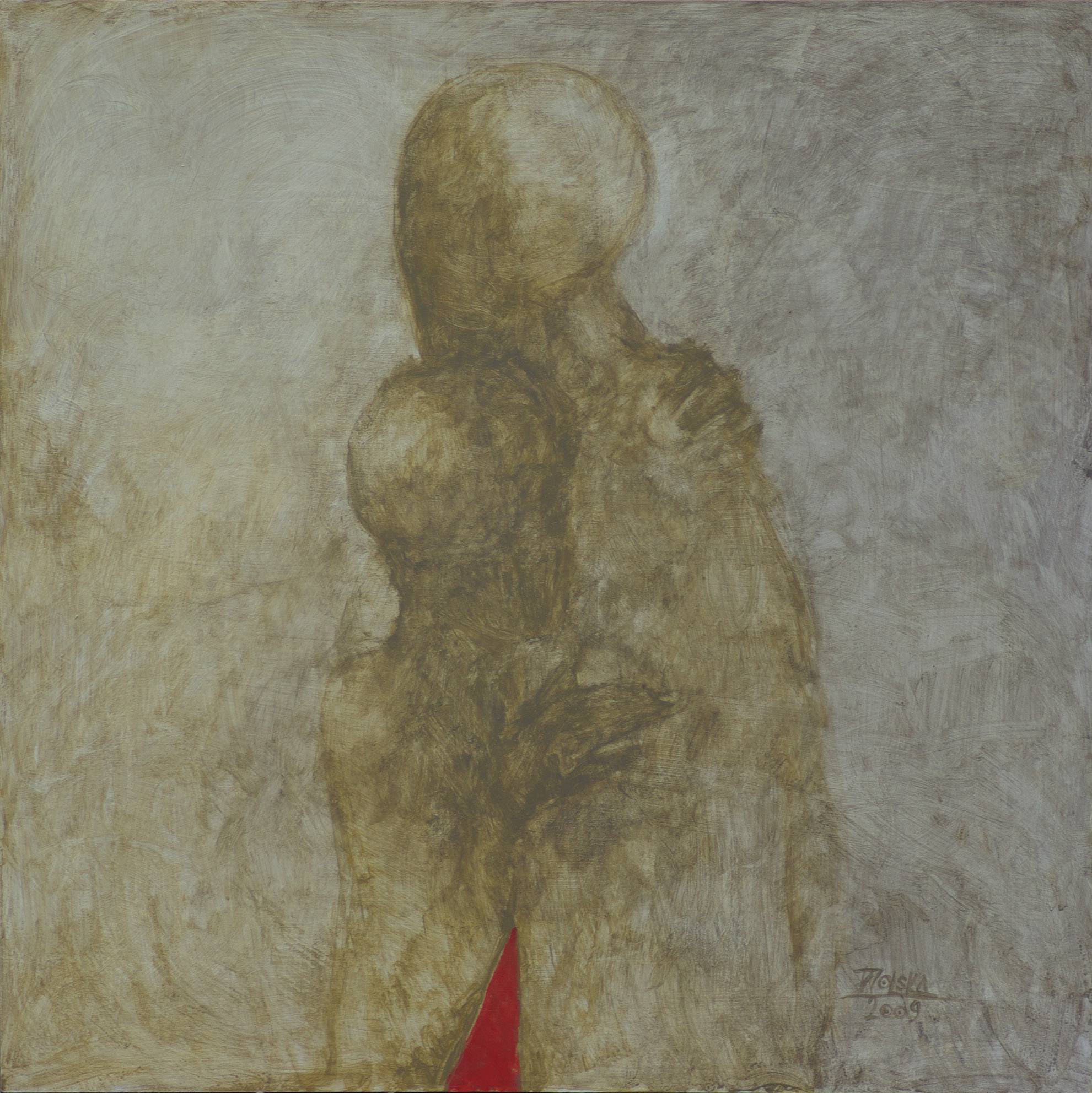 Obraz emanuje tajemniczością, dominują tu stonowane, ziemiste barwy z delikatnym akcentem czerwieni. Kształty są miękkie, rozmyte, co nadaje całości eterycznego charakteru. Postacie, które można dostrzec, zlewają się z tłem, jakby chciały się w nim ukryć. Atmosfera jest jednocześnie spokojna, ale i nieco melancholiczna. Odrobinę jakby się można było zgubić we własnych myślach i emocjach. Technicznie, artysta zastosował delikatne pociągnięcia pędzla, dając wrażenie ruchu i ciepła. Styl jest impresyjny, z nutą abstrakcji, co przypomina dreamlike quality obrazów, które pobudzają wyobraźnię. To jakby wszystko było zawieszone pomiędzy snem a rzeczywistością, gdzie granice są zamazane. U odbiorcy może wywołać wiele emocji – od niczym niezakłóconego spokoju po smutek wynikający z izolacji. Wyobraźnia płata figle, a każdy dostrzega coś innego. Mały chłopiec mógłby powiedzieć: "To wygląda jak wielki uścisk mamy!". To obraz, który zmusza do refleksji nad relacjami i emocjami, a może nawet nad samym sobą. Czerwień, choć subtelna, przypomina o pasji, intensywności życia, które czasami ginie w szarościach codzienności. Trudno oderwać od niego wzrok, przyciąga jak magnes. I to jest w tym najpiękniejsze.
