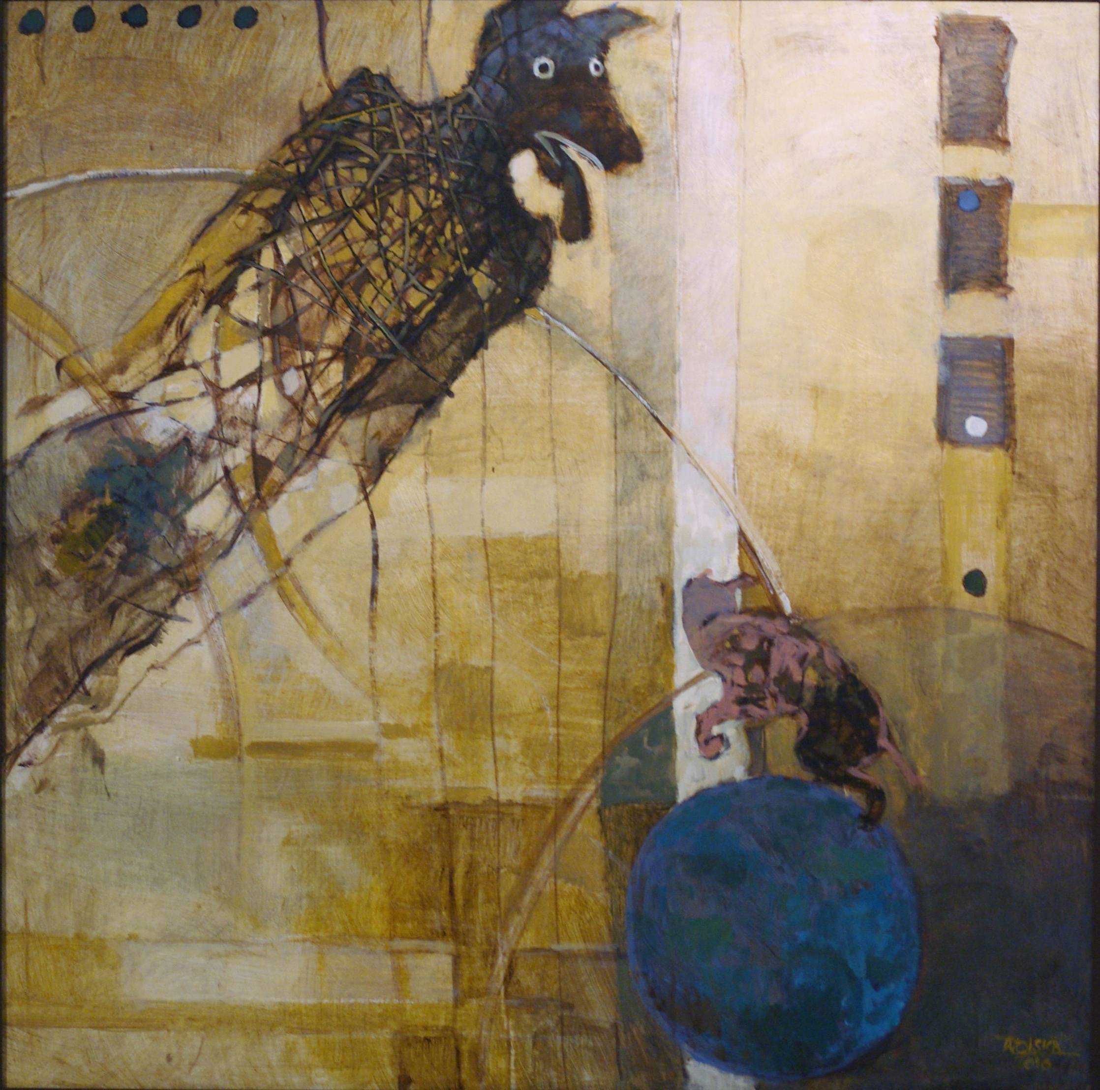 Akryl na płycie, 90x90 cm, werniksowany, oprawiony w prostą sosnową ramę malowaną na ciemny brąz. Rok powstania 2010