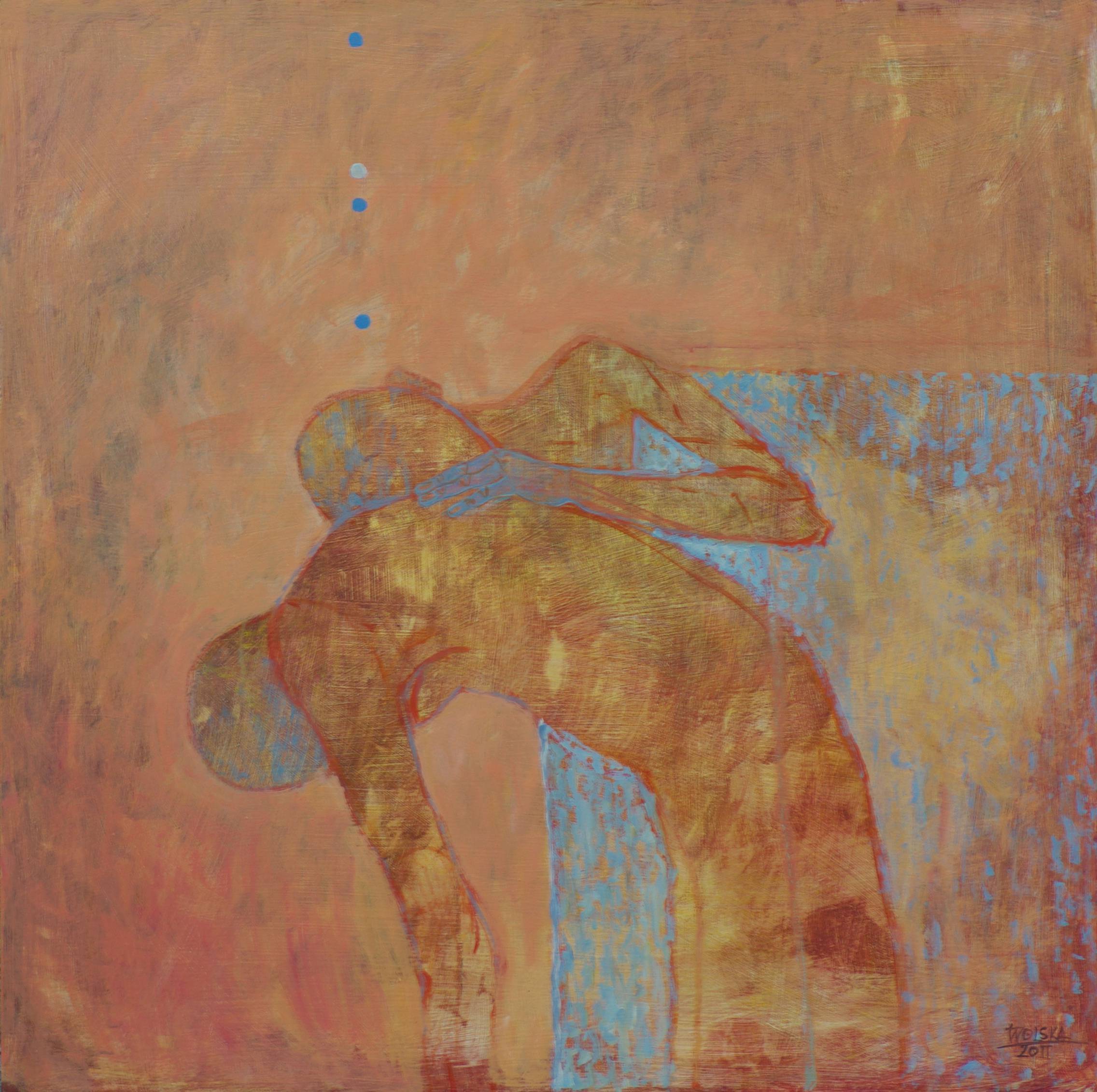 Akryl na płycie, 90x90, werniksowany, sygnowany, oprawiony w prostą, drewniną, malowaną ramę. Rok powstania 2011