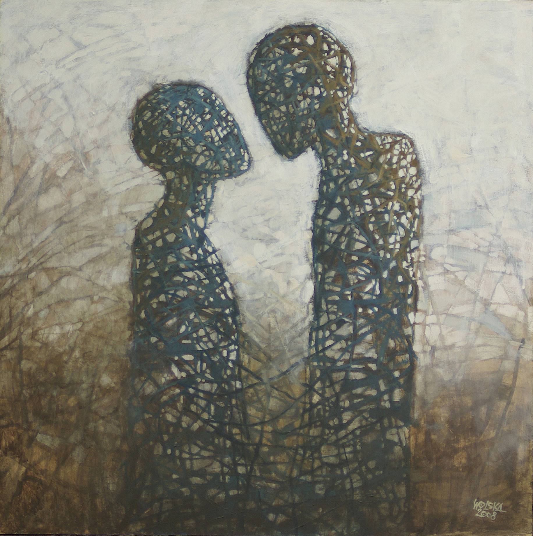 Obraz ukazuje dwie postacie, których zarysy przypominają ażurową konstrukcję splecioną z ciemnych linii. Te figury zdają się zatopione w mglistym tle, mieszance stonowanych odcieni brązu i szarości. Kompozycja przyciąga wzrok do centralnej części, gdzie twarze postaci niemal się dotykają. Jest w tym coś przyciągającego, jakby niewidzialna siła je łączyła. Artysta zastosował technikę przypominającą splątany labirynt, dając wrażenie chaosu i delikatności jednocześnie. Nastrój dzieła jest nieco tajemniczy, chwilami nawet melancholijny. Można poczuć w nim ciszę, jakby te postacie były zanurzone w swoich myślach. Linie, które je tworzą, przypominają mi gałęzie drzew – fragile, ale silne. Gdy patrzę na ten obraz, czuję spokój, jakby zatrzymany moment z życia chwil zatrzymanych w czasie. Dzieło zdaje się przemawiać o ludzkich więziach, o relacjach, które są skomplikowane, jak "puzzle", ale jednocześnie piękne w swojej zawiłej prostocie. Technika mieszania kolorów i kształtów dodaje całości dynamiczności. Mimo że obraz jest statyczny, ma się wrażenie ruchu, jakby postacie zaraz miały się poruszyć. Odbiorca może poczuć tę subtelną nutę napięcia, jak się patrzy. Może wywołać refleksję nad tym, jak bliskość i dystans często idą w parze. Wow, ale to jest magiczne. Artysta stworzył coś, co porusza i skłania do przemyśleń. To jak rozmowa bez słów, gdzie każda kreska opowiada własną historię.
