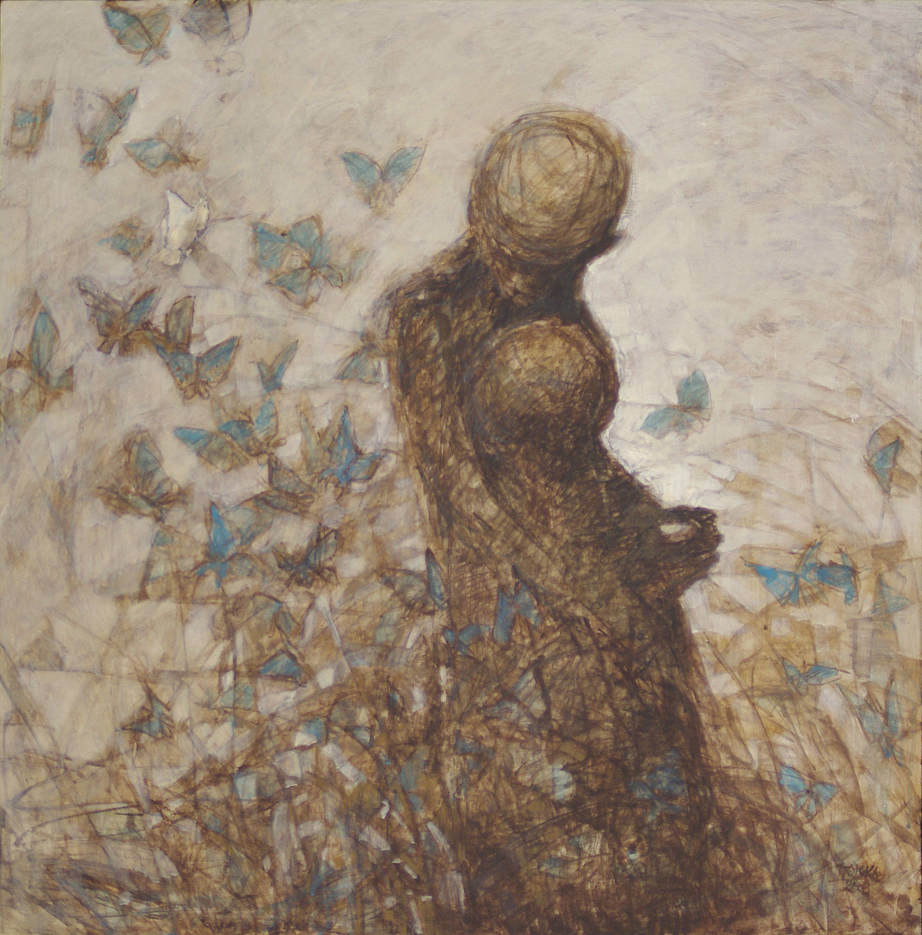 Obraz przedstawia rozmytą postać zanurzoną w chmurze błękitnych motyli. Utrzymany jest w stonowanej palecie barw — dominują odcienie brązu i beżu, które tworzą ciepłe, melancholijne tło. Motyle, lekkie jak marzenia, unoszą się wokół postaci, kontrastując niebieskim kolorem z resztą kompozycji. A ta figura trochę jak z innego świata, jakby wyłoniła się z mgły. Atmosfera jest tajemnicza i nostalgiczna. Można poczuć ten delikatny dreszcz spokoju. Artysta zastosował szept pędzla i subtelne, miękkie linie. Technika ma w sobie coś z dreamlandu, gdzie rzeczywistość spotyka się z surrealizmem. Obraz może przywodzić na myśl wolność, ulotność chwili, a może też tęsknotę za czymś nieuchwytnym. Taki ach moment, kiedy wszystko jest możliwe. Hey, someone's left a magic door open! Każdy motyl to jak myśl rozpraszająca się w powietrzu. Dla mnie to niesamowite, jak artysta potrafi malować emocjami. Bo w sumie, czuję, że jestem tam, razem z tymi motylami. Mała refleksja — choć obraz wydaje się spokojny, to kryje w sobie wiele pytań. Jakby życie było snem, a my tylko przelotnymi gośćmi. Kto wie, maybe jest to moment przemiany lub powrotu do siebie. Światło na horyzoncie, nadziei cień. To dzieło, które każdy powinien zobaczyć na własne oczy.
