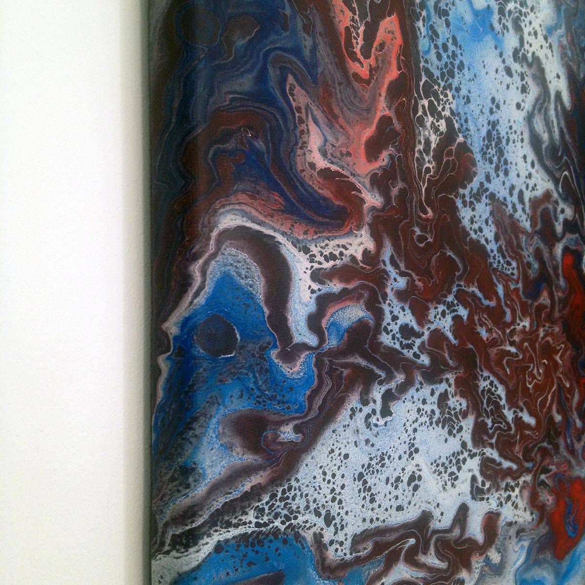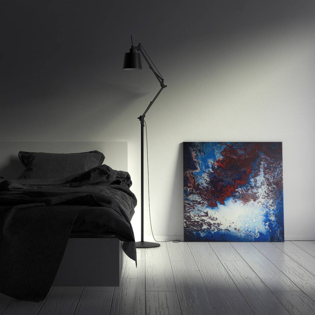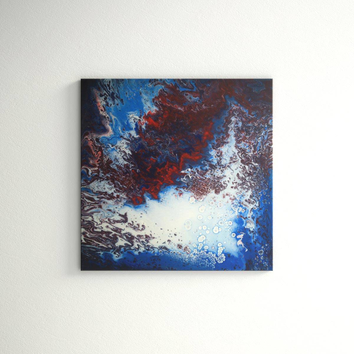 Obraz zachwyca dynamicznymi wirami kolorów, gdzie głębokie odcienie niebieskiego splatają się z intensywną czerwienią. Wygląda to trochę jak eksplozja w kosmosie, pełna energii i tajemniczości. Kompozycja jest chaotycznie piękna, przypominając abstrakcyjną mapę emocji zatopioną w czynnikach nieprzewidywalnych. Atmosfera dzieła jest zarówno przyciągająca, jak i niepokojąca. Czujesz w niej pewnego rodzaju burzę, może nawet sztorm na morzu niewiadomego. Artysta zastosował tutaj technikę pouringu, gdzie farby płynnie mieszają się na płótnie, tworząc niepowtarzalne wzory. Taka swobodna technika dodaje dziełu organiczności, przypomina mi zabawy z kałużami. "It’s like a dance," pomyśleć można. Obraz wywołuje wiele emocji, od zachwytu nad kolorem do pewnej refleksji nad ludzką duchowością. Patrząc na to dzieło, można poczuć, jakby czas na chwilę stanął w miejscu. Czy to właśnie chaos, czy spokój w nim znajdujemy? Widząc ten obraz, nie przestaję się zastanawiać, co jeszcze w nim odkryję. Ale mama, te kształty są jak dżinsy! Zachwyca i zmusza do myśli, które krążą gdzieś na skraju racjonalności. Fascynujący mix różnych stylów i technik, które tworzą niesamowity spektakl na małej scenie płótna.