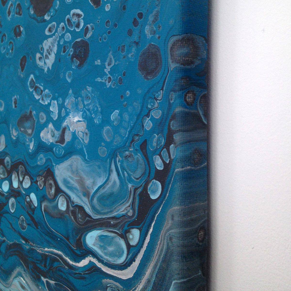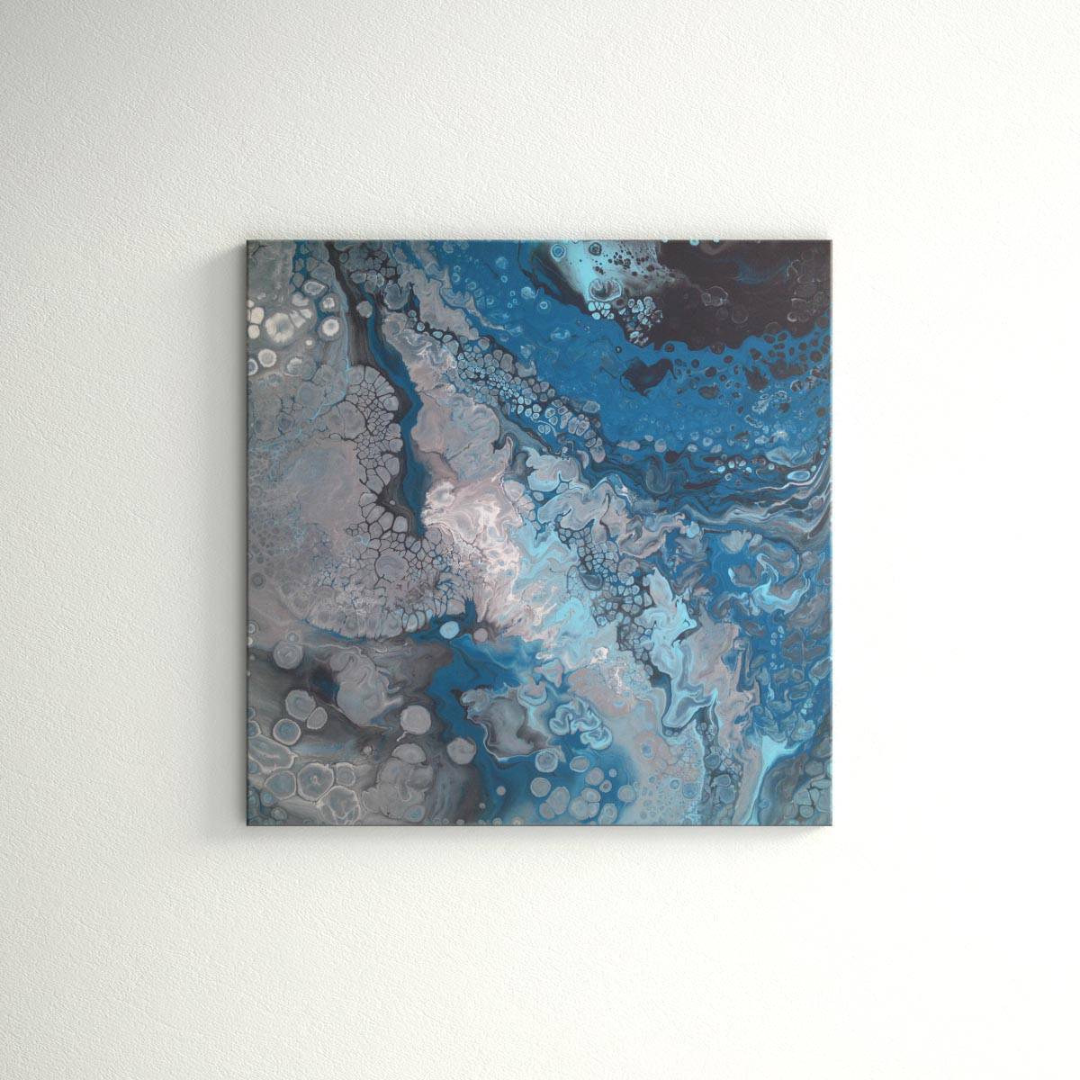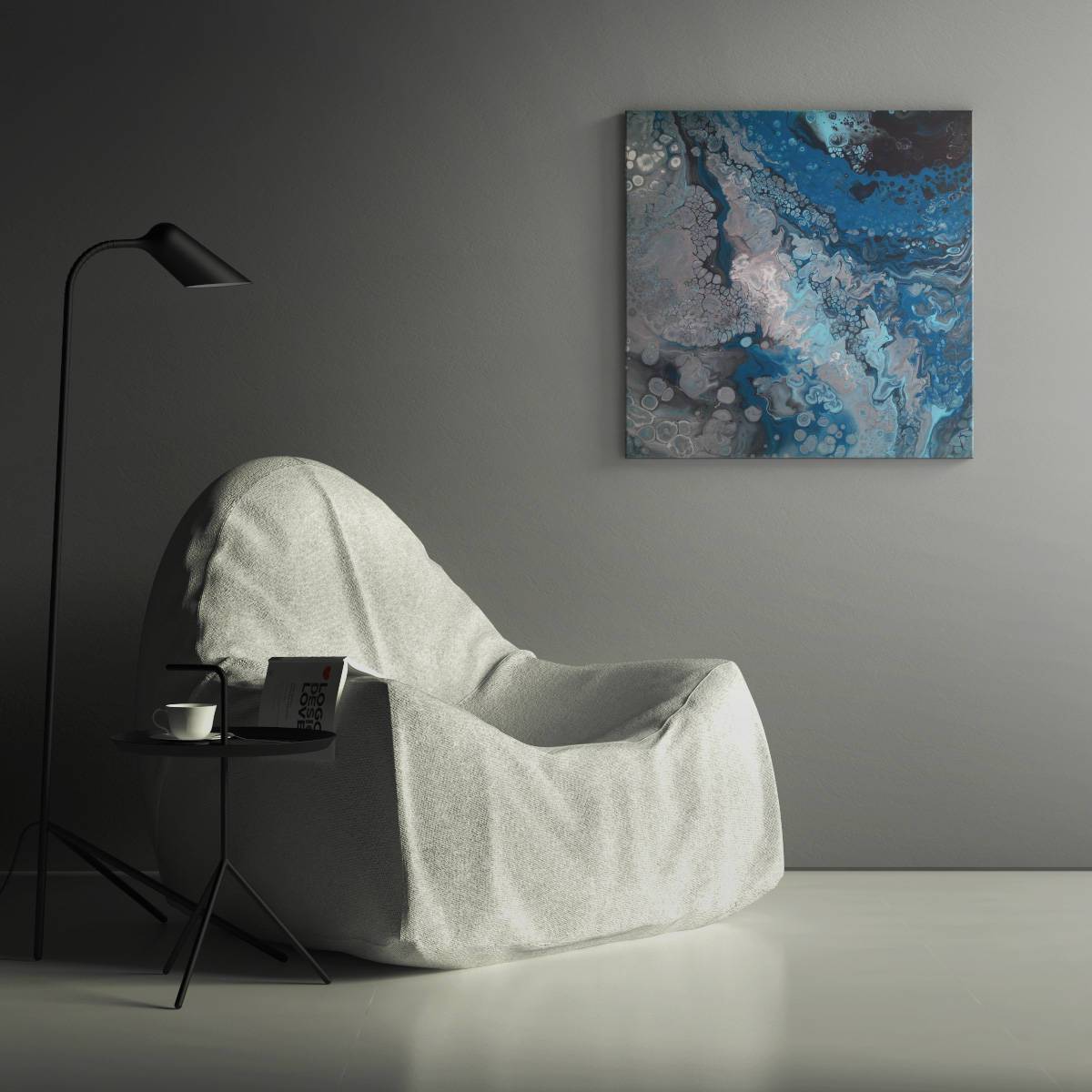 Na obrazie dominuje kontraścik między odcieniami niebieskiego a szarym, które falują niczym ocean w burzliwy dzień. Kompozycja przypomina abstrakcyjną mapę podwodnego świata. W tej mieszance wyraźne linie przeplatają się z delikatnymi, okrągłymi kształtami, tworząc wrażenie ruchu i dynamiki. Atmosfera obrazu jest pełna magii, trochę jakby patrzeć na nocne niebo przesiane morską pianą. Techniką zastosowaną przez artystę jest prawdopodobnie fluid painting, co dodaje pracy specyficznego nieładu, ale i harmonii jednocześnie. Widz może poczuć zagubienie, ale i ciekawość – co kryje się dalej? Takie obrazy wywołują emocje – może nawet chęć zanurzenia się w tym niezwykłym świecie. "I like blue, it’s like the sky," powiedziałby mały odkrywca. To prawdziwy "wow factor", który przyciąga spojrzenie na dłużej. Patrząc na to dzieło, można odpłynąć myślami daleko. Zaskakujące, jak taki chaos może być jednocześnie tak kojący. Co o tym sądzisz?