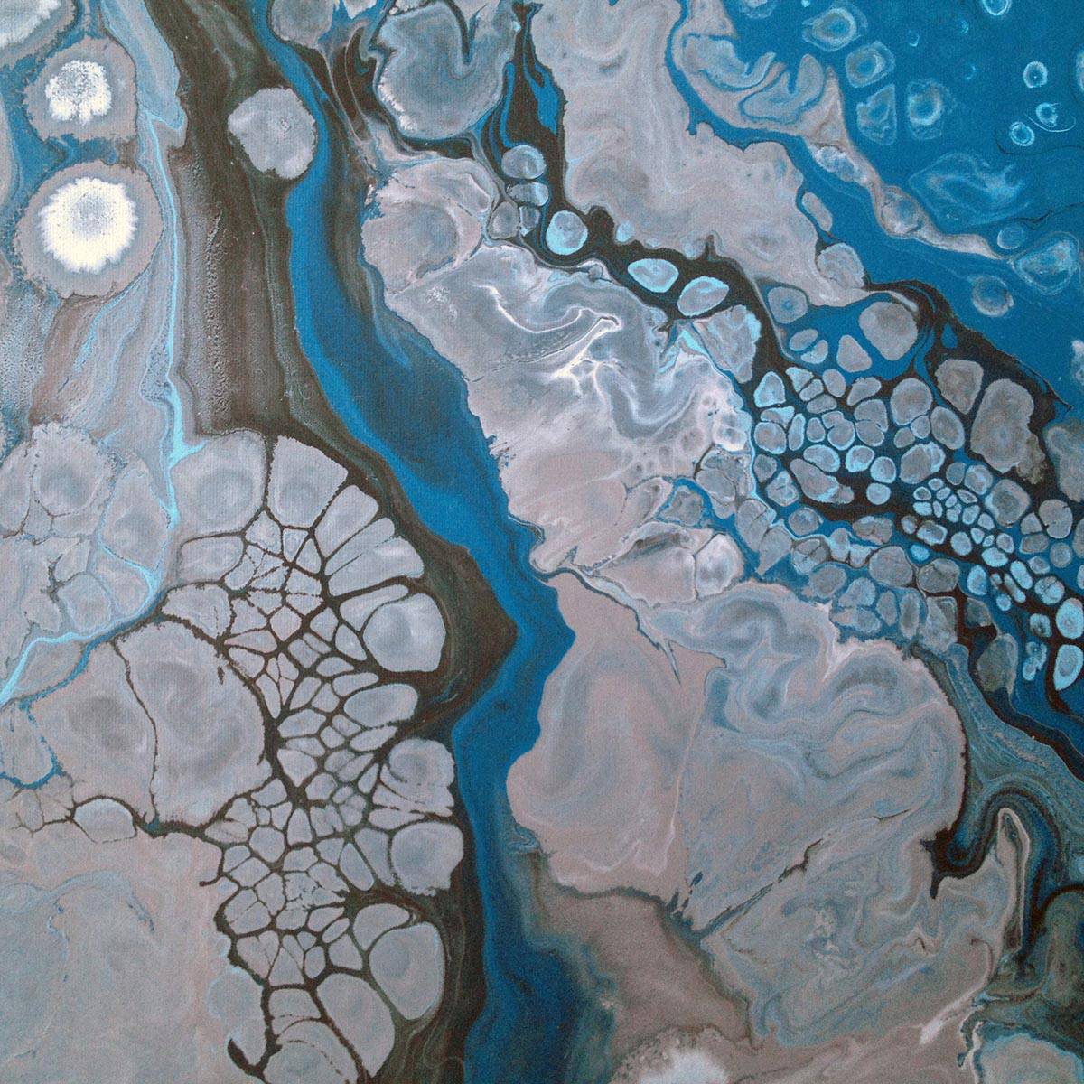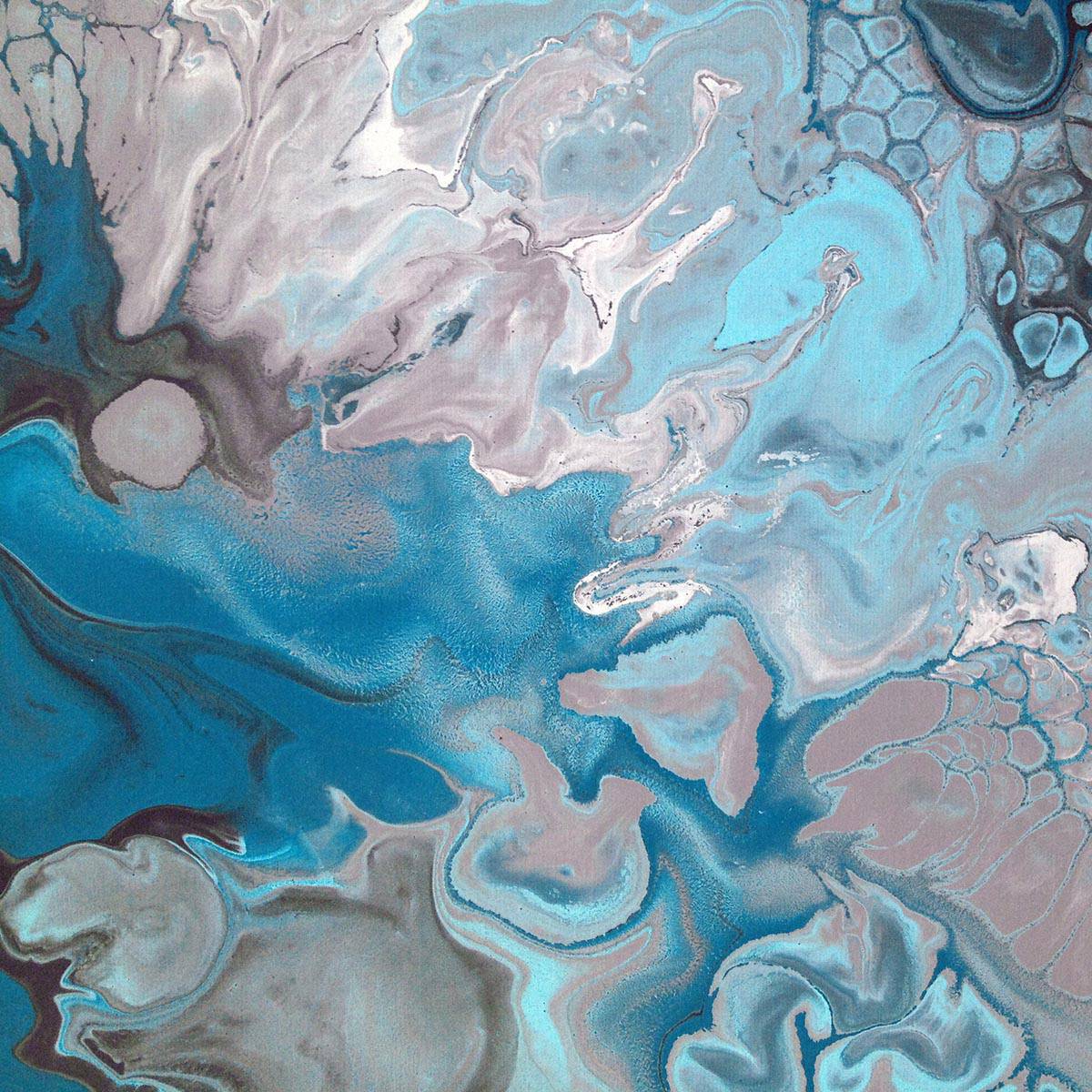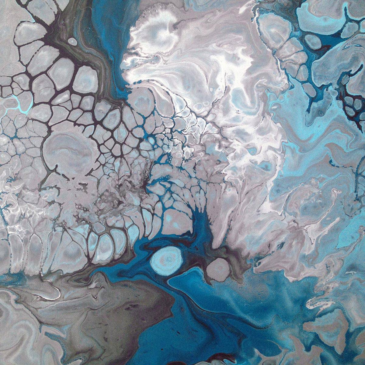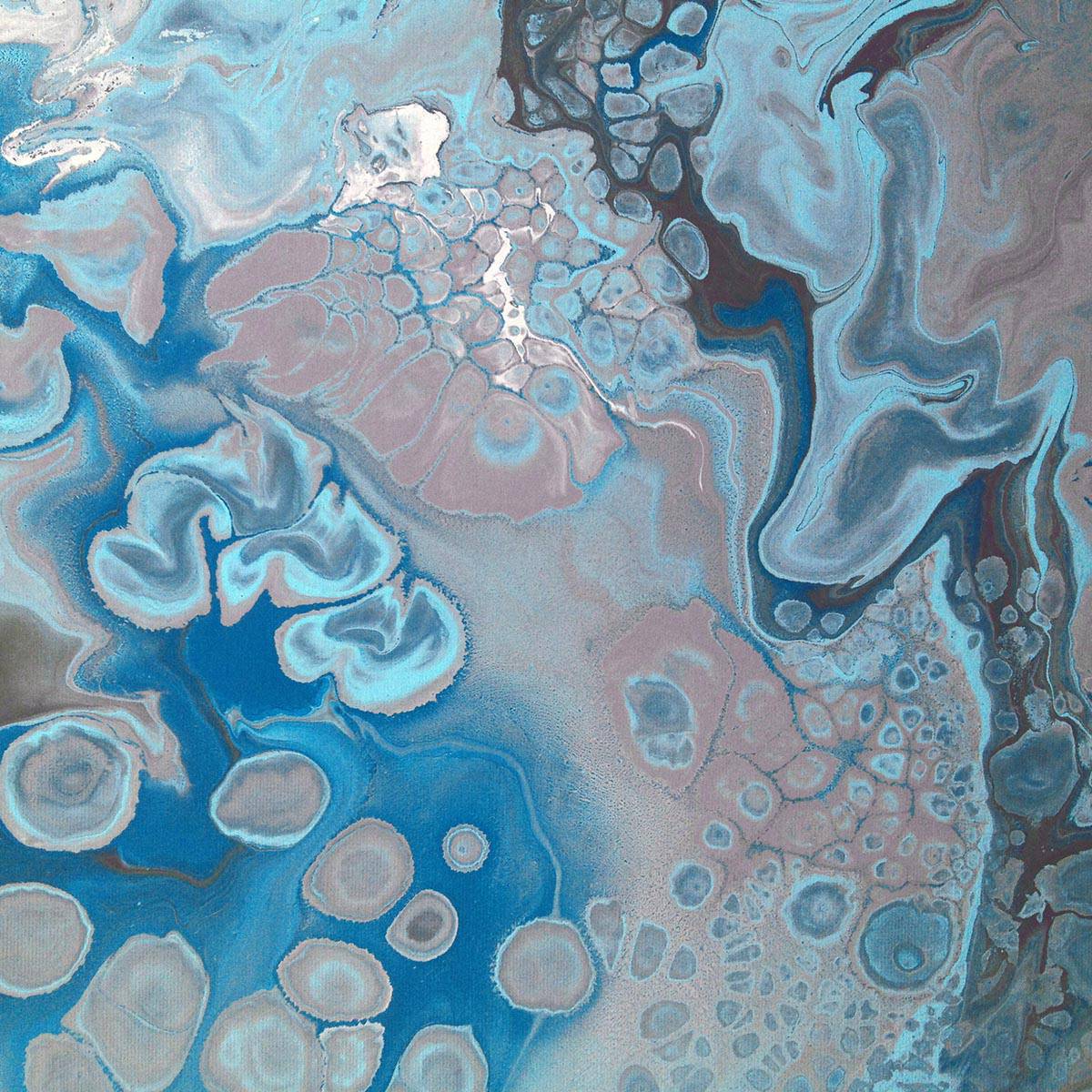 Na obrazie dominuje kontraścik między odcieniami niebieskiego a szarym, które falują niczym ocean w burzliwy dzień. Kompozycja przypomina abstrakcyjną mapę podwodnego świata. W tej mieszance wyraźne linie przeplatają się z delikatnymi, okrągłymi kształtami, tworząc wrażenie ruchu i dynamiki. Atmosfera obrazu jest pełna magii, trochę jakby patrzeć na nocne niebo przesiane morską pianą. Techniką zastosowaną przez artystę jest prawdopodobnie fluid painting, co dodaje pracy specyficznego nieładu, ale i harmonii jednocześnie. Widz może poczuć zagubienie, ale i ciekawość – co kryje się dalej? Takie obrazy wywołują emocje – może nawet chęć zanurzenia się w tym niezwykłym świecie. "I like blue, it’s like the sky," powiedziałby mały odkrywca. To prawdziwy "wow factor", który przyciąga spojrzenie na dłużej. Patrząc na to dzieło, można odpłynąć myślami daleko. Zaskakujące, jak taki chaos może być jednocześnie tak kojący. Co o tym sądzisz?