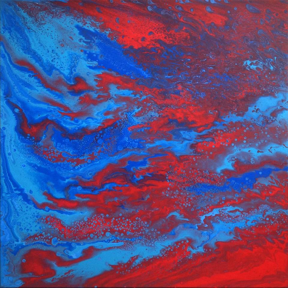Na obrazie dominują hipnotyzujące fale intensywnej czerwieni i głębokiego błękitu, które niemal tańczą ze sobą w dynamicznym wirze kolorów. Kompozycja jest żywa, a kolory zdają się niemal ze sobą ścierać, tworząc wrażenie ruchu i nieustannej zmiany. Atmosfera obrazu jest pełna energii i pasji, jakby uchwycono samą esencję burzy emocji. Ten obraz mówi ci: "hey, look at me!", sycąc oczy swoim kontrastem. Artysta zastosował technikę pouringu, co nadaje dziełu organiczny charakter i nieprzewidywalność formy. Dzięki temu obraz zdaje się oddychać, emanując siłą i nieokiełznaną ekspresją. W detalach widać subtelne bąbelki, które wprowadzają teksturę, jakby powierzchnia była pokryta rosą. Patrząc na to, ma się wrażenie bycia na krawędzi czegoś wielkiego i nieodkrytego. Obraz może budzić różnorodne emocje — od zachwytu po niepokoj. Może to przypominać niektórym niebiańskie chmury, innym burze emocji. Jeden z moich kolegów powiedział, że to jak spojrzenie w chaos, który jest w nas wszystkich. Dla mnie to prawie jak ogniste smoki i lodowe węże w bitwie. Wywołuje to uczucie ekscytacji i inspiracji, otwierając drzwi dla wyobraźni. Obraz ten jest prawdziwym majstersztykiem kolorystycznej energii i nieposkromionej kreatywności. Wow, ale to piękny!