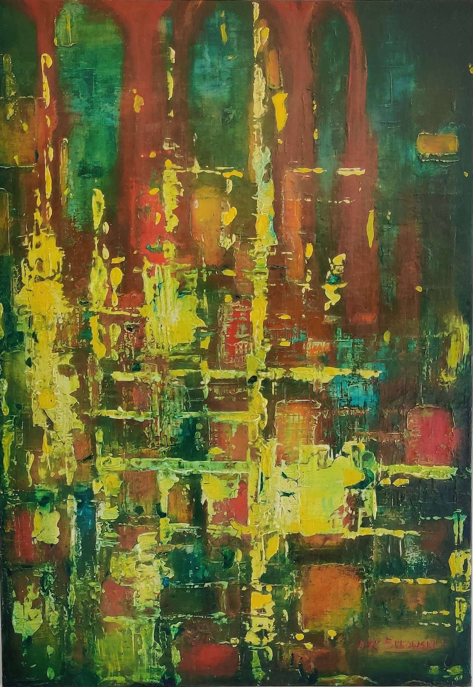 Wysublimowana gra kolorów, bogata faktura, rozmaitość plam barwnych.Format 70/100cm, płótno, olej, akryl, masa szpachlowa, sygnowany w dolnym rogu, zamalowane krawędzie.