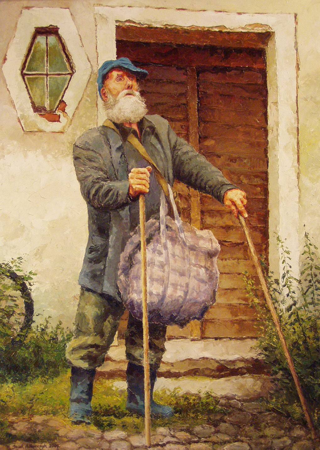 Obraz przedstawia starszego mężczyznę stojącego przed drewnianymi drzwiami, z torbą i kijem w rękach. Barwy są ziemiste, z dominacją brązów, zieleni i odcieni szarości. Figura mężczyzny, jego postawa i wyraz twarzy sugerują pewną determinację oraz przemęczenie. Ma brodę i niebieską czapkę, co nadaje mu charakteru wędrowca. Obok mężczyzny znajduje się staromodna szybka o unikalnym, heksagonalnym kształcie. Dzieło emanuje spokojem, ale i nostalgią, przypominając o prostych wiejskich scenach dawnych czasów. Artysta zastosował technikę impastu, co nadaje obrazowi teksturę i głębię. Pociągnięcia pędzla są wyraźne, co dodaje żywiołowości. Obraz może wywoływać refleksje nad upływem czasu i życiowymi wyborami. Mężczyzna wygląda jakby mógł opowiedzieć wiele „stories” ze swojego życia. Patrząc na dzieło, można poczuć ciepło i sympatię do tej prostej sceny, choć nieco melancholijnej. Myślę, że ten pan kiedyś był rycerzem. Każdy detal, od zmarszczek po strukturę tkaniny, przyciąga uwagę i zachęca do zatrzymania się na chwilę.