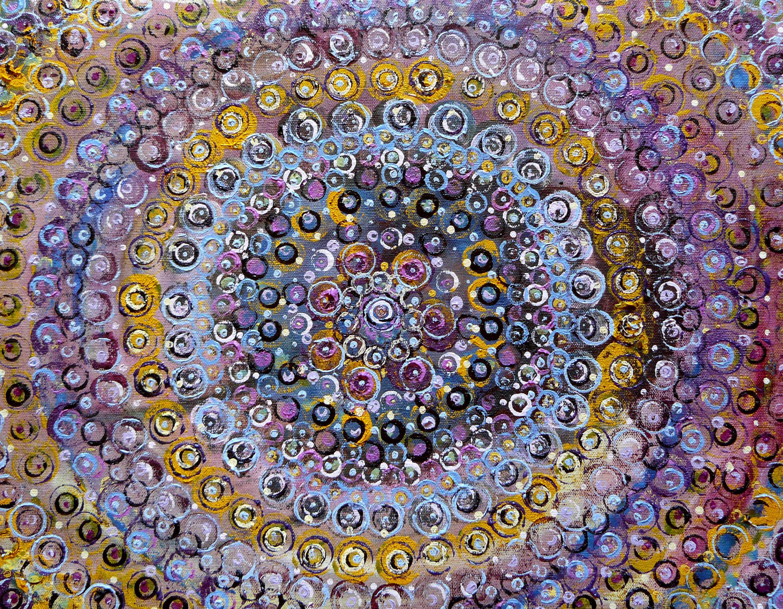 Obraz przedstawia hipnotyzującą kompozycję kółek i okręgów, które wirują jak magiczna mandala. Dominują tu ciepłe odcienie fioletu, żółci i srebra, które przeplatają się niczym muzyka w kalejdoskopie barw. Kompozycja jest dynamiczna, z centralnym punktem, który przyciąga wzrok. Artysta zastosował technikę impastu, nakładając farbę grubymi warstwami, co nadaje dziełu teksturę i głębię. Czuje się w tym radość i spontaniczność, jakby ktoś po prostu bawił się kolorami i kształtami. To jak stado wesołych kółeczek tańczących w rytm we własnym, kolorowym świecie. Całość emanuje pozytywną energią, która pobudza wyobraźnię. Może przypomina o dzieciństwie, kiedy rysowanie było przygodą bez końca. Dla mnie osobiście, obraz wywołuje uczucie spokoju i jednocześnie ekscytacji, jak patrzenie na niebo pełne gwiazd. Jest w tym jakaś magiczna aura, która sprawia, że można się w nim zatracić. This piece truly captures "vibrancy" in its purest form. Typowe dla stylu abstrakcyjnego, dzieło oferuje wolność interpretacji i zachęca do odkrywania własnych znaczeń. Po prostu cudo.