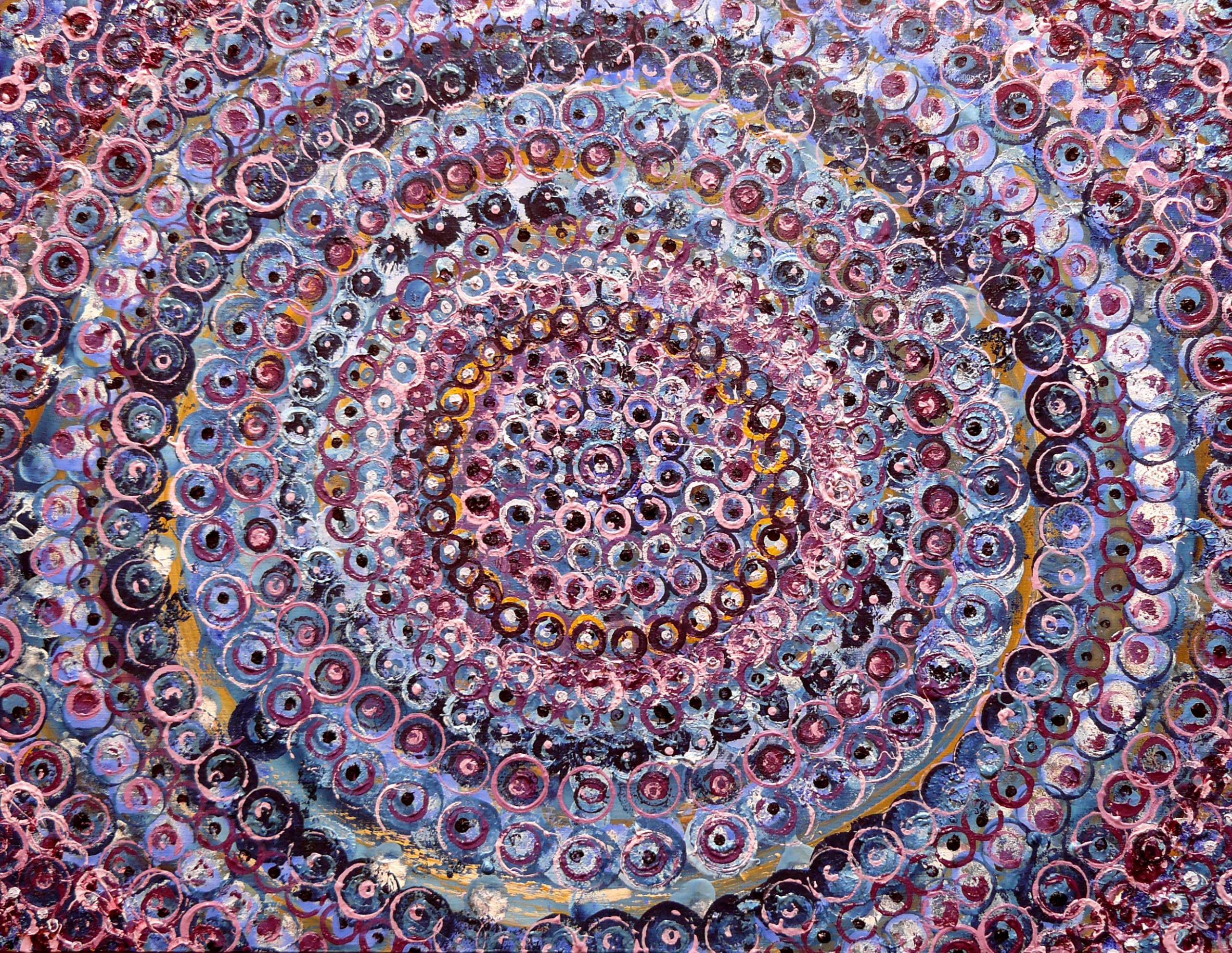 Obraz ten to prawdziwa eksplozja kolorów i kształtów, które wirują w magicznej spirali. Dominują tu odcienie fioletu, niebieskiego i różu, które łączą się w nieskończoną mozaikę kółek. Każdy z nich zdaje się pulsować, przyciągając wzrok jak hipnotyczny wir. Atmosfera jest nieco psychodeliczna, jakby wprowadzała nas w trans, a każda warstwa odkrywa coś nowego. Artysta z pewnością eksperymentował z techniką impasto, nałożył grubą warstwę farby, by uzyskać teksturę i głębię. To trochę jak wtedy, gdy patrzysz w kalejdoskop i widzisz magiczny świat. Ten obraz może budzić różne emocje. Dla jednych będzie to fascynacja, dla innych lekka dezorientacja. Przywodzi na myśl myśli o nieskończoności i chaosie. Można odnieść wrażenie, że każdy kolor i kształt ma swoje miejsce w tej kosmicznej układance. Wow, look at all the colors! – powiedziałoby dziecko. Jest to dzieło, które skłania do refleksji, może zachwycić, ale i zirytować swoją złożonością. Wciąga i nie puszcza, jak dobra książka czy film. Osobiście czuję lekkie oszołomienie, a może nawet zachwyt nad tym chaosem, który jednak w pewien sposób wydaje się uporządkowany.