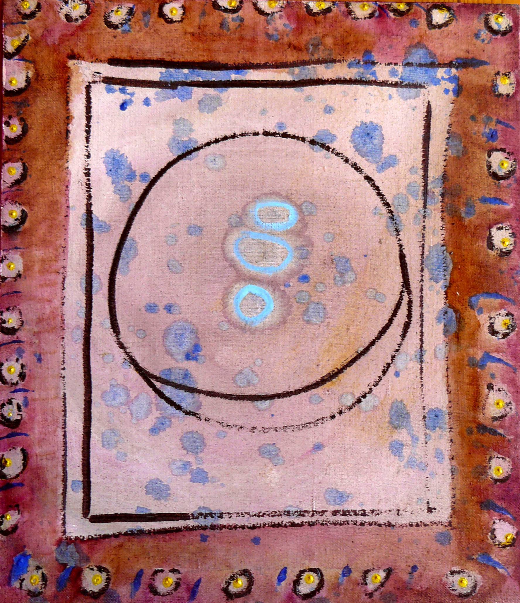 Obraz emanuje niesamowitą energią i spokojem. Dominuje tu złocisty brąz, który otula kompozycję niczym ciepły koc, a w środku króluje pudrowy róż przetykany błękitnymi plamkami. Takie połączenie kolorów przywołuje na myśl zachód słońca, kiedy niebo mieni się niezliczonymi odcieniami. Centralnym punktem kompozycji jest duże, dość niedbałe kółko, obrysowane czarną linią, przypominające orbitę wokół niewidocznej planety. Obraz bucha abstrakcyjnym stylem — artysta bawi się formą i kolorem, tworząc coś, co z jednej strony jest proste, a z drugiej intrygujące. Patrząc na ten obraz, można poczuć jakby czas stanął w miejscu. Technika, którą artysta się posłużył, to prawdopodobnie akwarele, które mają tę magiczną właściwość, że nadają płynności i lekkości każdemu pociągnięciu pędzla. Na brzegach obrazu widać drobne okręgi, jakby ktoś chciał dodać ramkę z guzików. To very cool! Dzieło to wywołuje różnorodne emocje. Może to być nostalgia za dzieciństwem, kiedy rysowanie na kartkach papieru było beztroską zabawą. Albo wręcz przeciwnie — cień melancholii, refleksji nad upływem czasu. To naprawdę zachęca do zatrzymania się na moment, zastanowienia się nad tym, co jest ważne. I... wygląda trochę jak kosmos namalowany przez 7-letnie dziecko, który stawia pytania o prostotę i złożoność wszechświata.