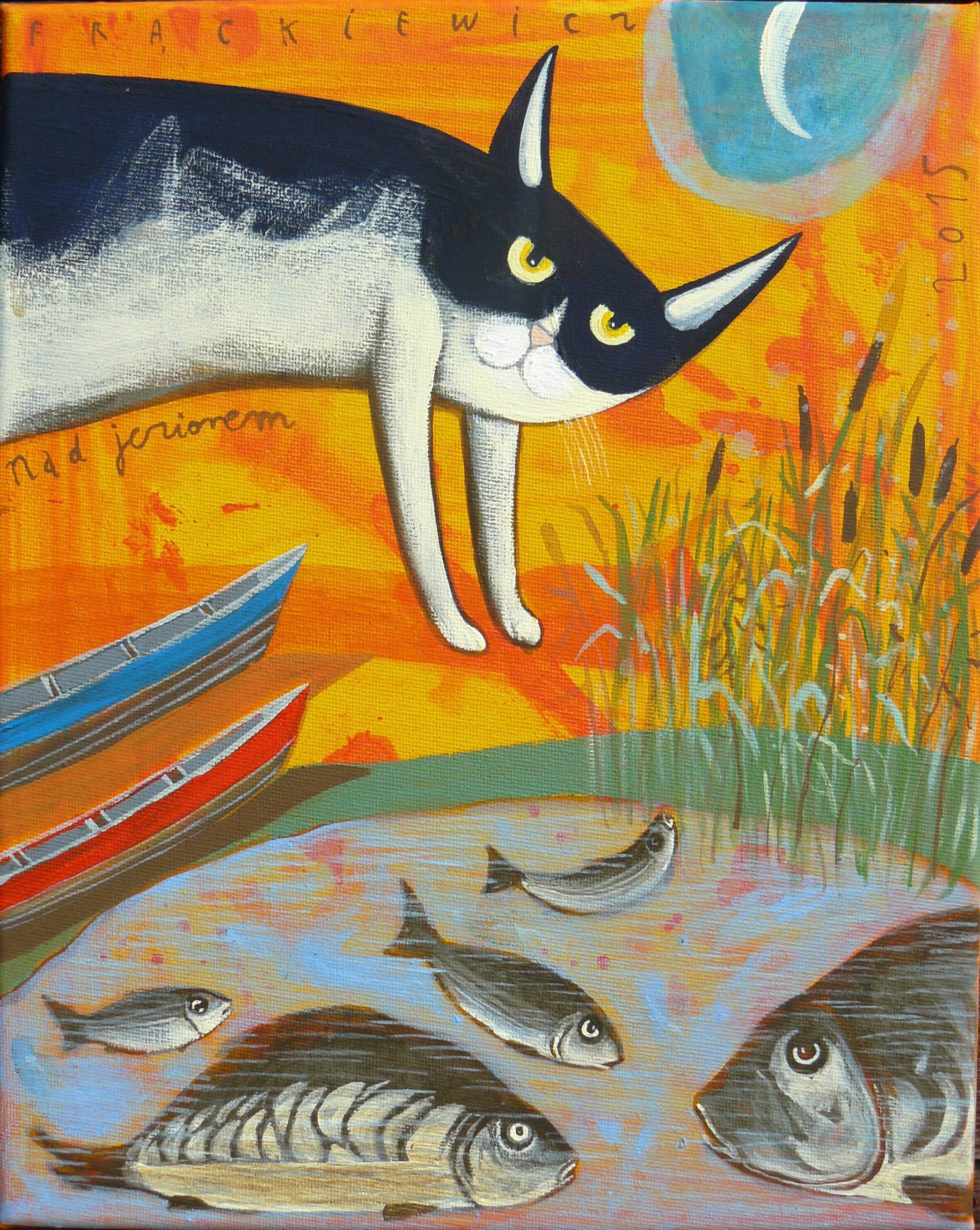 Obraz emanuje kolorem i dziwnością. Pomarańczowe tło zdaje się płonąć, a w jego głębi kontrastuje biel kota z czarnym pyszczkiem. Kształty są proste, niemal dziecięce, co nadaje całości urokliwej naiwności. Kompozycja jest dynamiczna - kot zdaje się skakać nad wodą, gdzie pływają ryby. Atmosfera jest surrealistyczna i lekko komiczna. Wydaje się, jakby scena toczyła się w sennym marzeniu, gdzie koty i ryby żyją w harmony. Styl artystyczny jest pełen naiwności, co może wskazywać na inspiracje folk art. Artysta użył grubych pociągnięć pędzla, kładąc nacisk na żywe kolory. Technika wydaje się spontaniczna, jakby tworzenie obrazu było zabawą, a nie obowiązkiem. "Wow!" - pomyśli pewnie każdy, widząc kota patrzącego z takim skupieniem. Odbiorca może poczuć dziwaczne połączenie spokoju i energii. Kot jest skoncentrowany, a ryby wyglądają na niezbyt przejęte. Ten obraz mówi wiele o naturze marzeń, a może po prostu o beztrosce letniego popołudnia. I wtedy przychodzi refleksja: jaki jest ten kot, co myśli? Obraz przenosi nas w inny świat, gdzie wszystko jest możliwe. Ciekawość wzbudza także jego tytuł, written in a playful manner. Ale czemu nad jeziorem, to dopiero zagadka. Fascynujący, prawda?