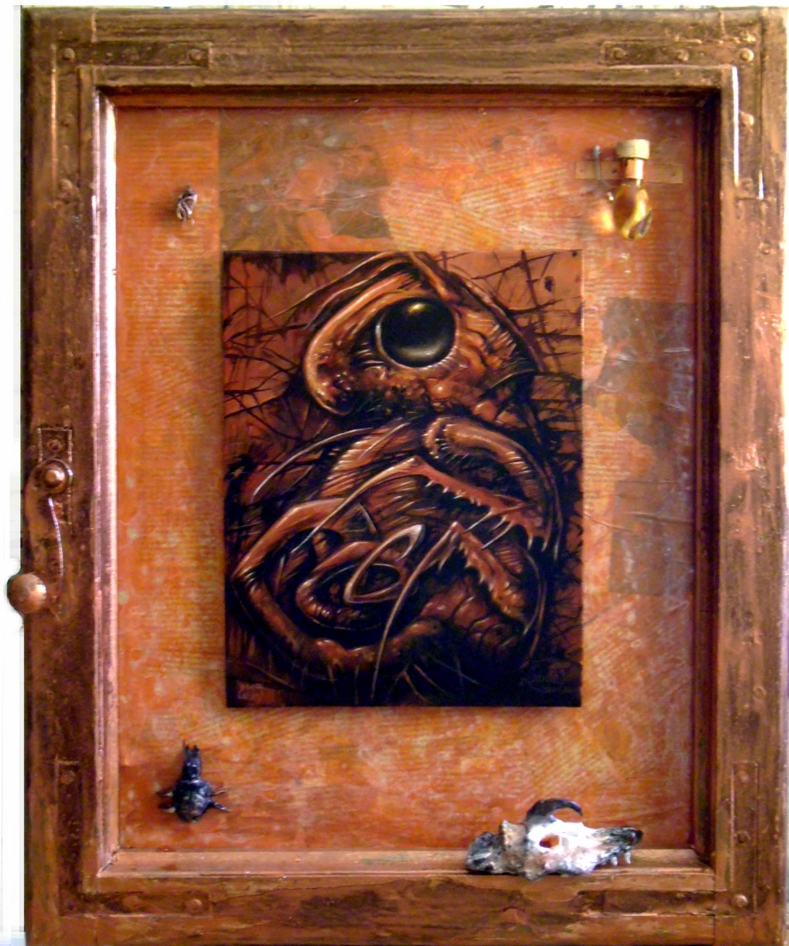 Obraz, który widzimy, to tajemnicza kompozycja zamknięta w solidnej, drewnianej ramie, która nadaje jej poczucie starożytności i siły. Kolory są ciepłe, dominują odcienie brązu i pomarańczy, przez co całość emanuje atmosferą tajemnicy i lekkiego niepokoju. Centralny punkt obrazu to abstrakcyjne, organiczne kształty, przypominające zawiłe struktury pochodzące z natury. Artysta zdecydował się na użycie techniki, która nadaje dziełu teksturę – być może farby olejne, które dodają głębi i życia. Mamy tu do czynienia z warstwami linii i kształtów, które tworzą intrygujący, nieco chaotyczny wzór. Patrząc na ten obraz, można poczuć się jakby w świecie pełnym nieodkrytych tajemnic. Czy to może być oko jakiegoś pradawnego stworzenia? A może to całkiem co innego? Pod kompozycją znajdują się dziwne elementy, jakby wyjęte z gabinetu osobliwości: fragmenty zwierzęcych czaszek i insekty. Może to być symbol przemijania, ale kto wie? Dzieło wyzwala emocje, które trudno opisać jednym słowem. Tworzy odczucia typu mystery. Dla siedmiolatka może to być po prostu obraz potworów. Bo przecież każdy obraz pcha do myślenia i wyobrażania sobie czegoś innego. Można niemal poczuć dotyk tych starych drewien, które okalają całą scenę, niczym oprawa jakiejś magicznej księgi. Dosłownie obraz, który mówi więcej niż tysiąc słów.