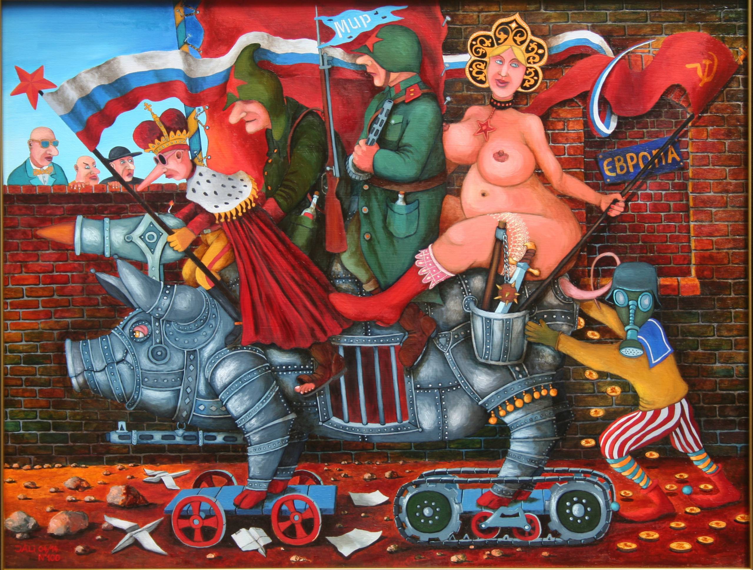 Na obrazie dominują żywe kolory i surrealistyczne formy, od razu przyciągające wzrok. Na pierwszym planie widzimy dziwaczny, metaliczny twór przypominający połączenie dzika z machiną wojenną. Na nim jadą postacie w barwnych, przerysowanych strojach przypominających kostiumy z bajek lub groteskowe satyry. Artysta posługuje się intensywnymi czerwieniami, błękitami i zieleniami, co nadaje całej kompozycji dynamicznego wyrazu. Tło to ceglana ściana z symbolami i flagami; surowość podkreśla komizm sytuacji. Atmosfera obrazu jest jednocześnie humorystyczna i niepokojąca. Świat przedstawiony wygląda jak pstrą rzeczywistość z pogranicza snu i jawy. Styl przypomina surrealizm połączony z elementami karykatury, tworząc efekt „wow". Technika jest precyzyjna, a detale perfekcyjnie odwzorowane, co można by nawet nazwać "mind-blowing". Obraz wywołuje emocje zażenowania, a także szczyptę fascynacji. Czujemy, że w tym chaosie jest głębszy sens, choć niełatwo go uchwycić. Mały chłopiec z maską gazową przyciąga uwagę swoją niewinnością, kontrastując z absurdem i dekadencją otoczenia. Patrząc na to dzieło, człowiek czuje się jak na rollercoasterze emocji - pomiędzy śmiechem a zakłopotaniem. W sumie to trochę jak wkrętka w kreskówce, gdzie wszystko jest podkręcone do granic możliwości.