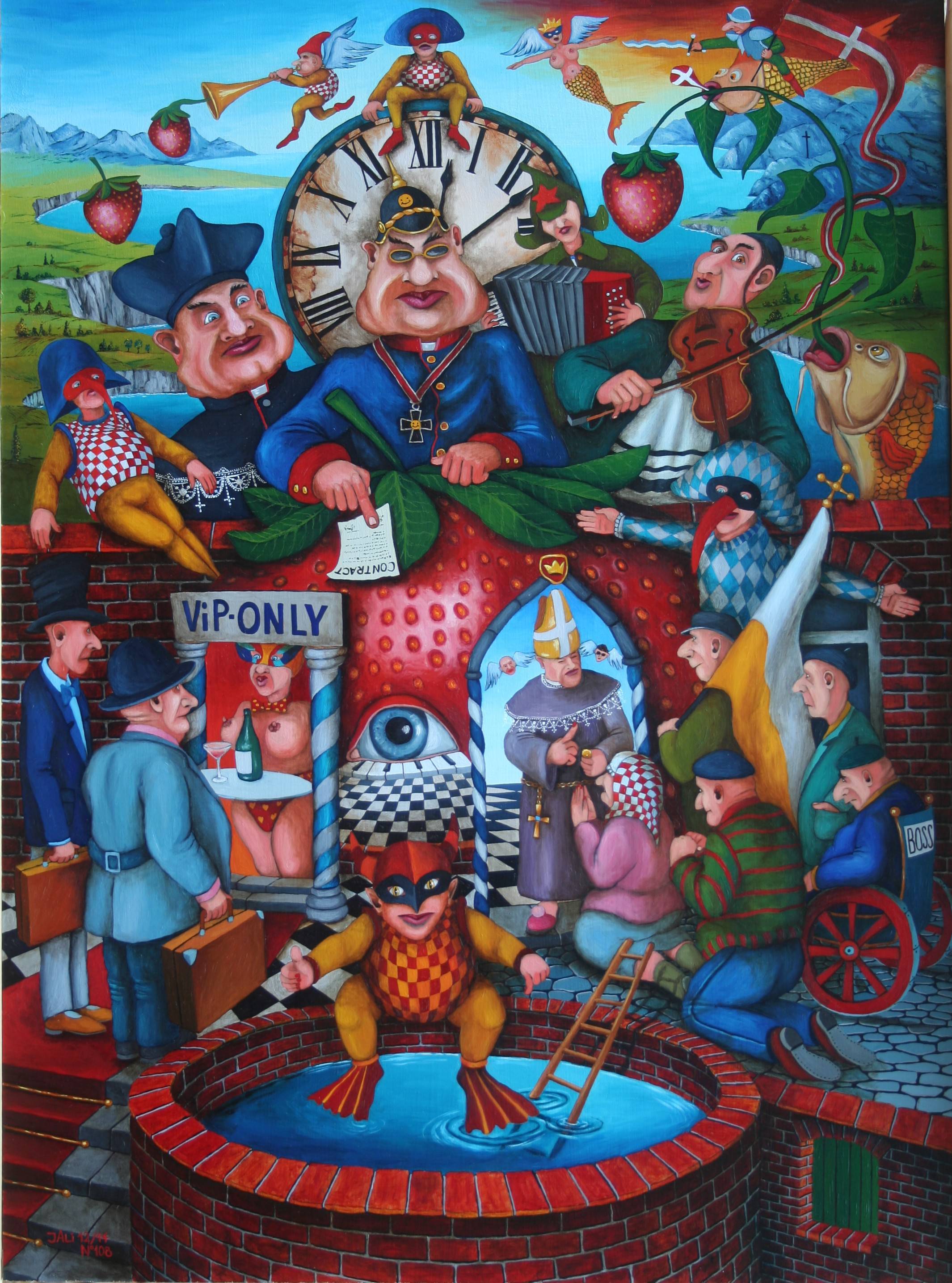 To dzieło to prawdziwa uczta dla oczu! Wchodzisz w świat pełen kolorowych postaci i surrealistycznych scen. W centrum obrazu ogromna truskawka oplata zegar, którego wskazówki zdają się nie mieć końca. Postacie wokół niej, z dużymi policzkami i dziwnymi kapeluszami, przyciągają wzrok jak magnes. Skarby, które można odkryć, to także zabawki trzymające instrumenty muzyczne, które nadają całej scenie dynamiczny, choć nieco niepokojący nastrój. Obraz niesie w sobie mieszankę humoru i absurdu. Jego tło to zielone, soczyste krajobrazy, przywołujące na myśl idylliczne pejzaże. Techniqe użyta do stworzenia tej fantastycznej wizji jest bardzo detailed, z trudnymi kształtami i kontrastującymi kolorami, które tworzą fascynującą kompozycję. Dzieło emanuje poczuciem chaosu, ale jest to chaos kontrolowany, pełen zamierzonych kontrastów. Widząc to, można poczuć się jak w innym świecie, gdzie czas płynie inaczej, a rzeczywistość zupełnie traci znaczenie. Może to wywołać uczucie zdziwienia, a nawet lekkiego zaniepokojenia, ale jednocześnie fascynacji. Takie dzieło może być interpretowane na wiele sposobów, ale jedno jest pewne - pozostawia widza z masą pytań i mnóstwem wytaźni. Coś jak sen, w którym nie wszystko ma sens, ale każdy element opowiada swoją własną, tajemniczą historię. "Patrz mamo, ryba gra na trąbce!" Właśnie taka mieszanka realności z marzycielską iluzją sprawia, że ten obraz jest jak podróż do innego wymiaru.