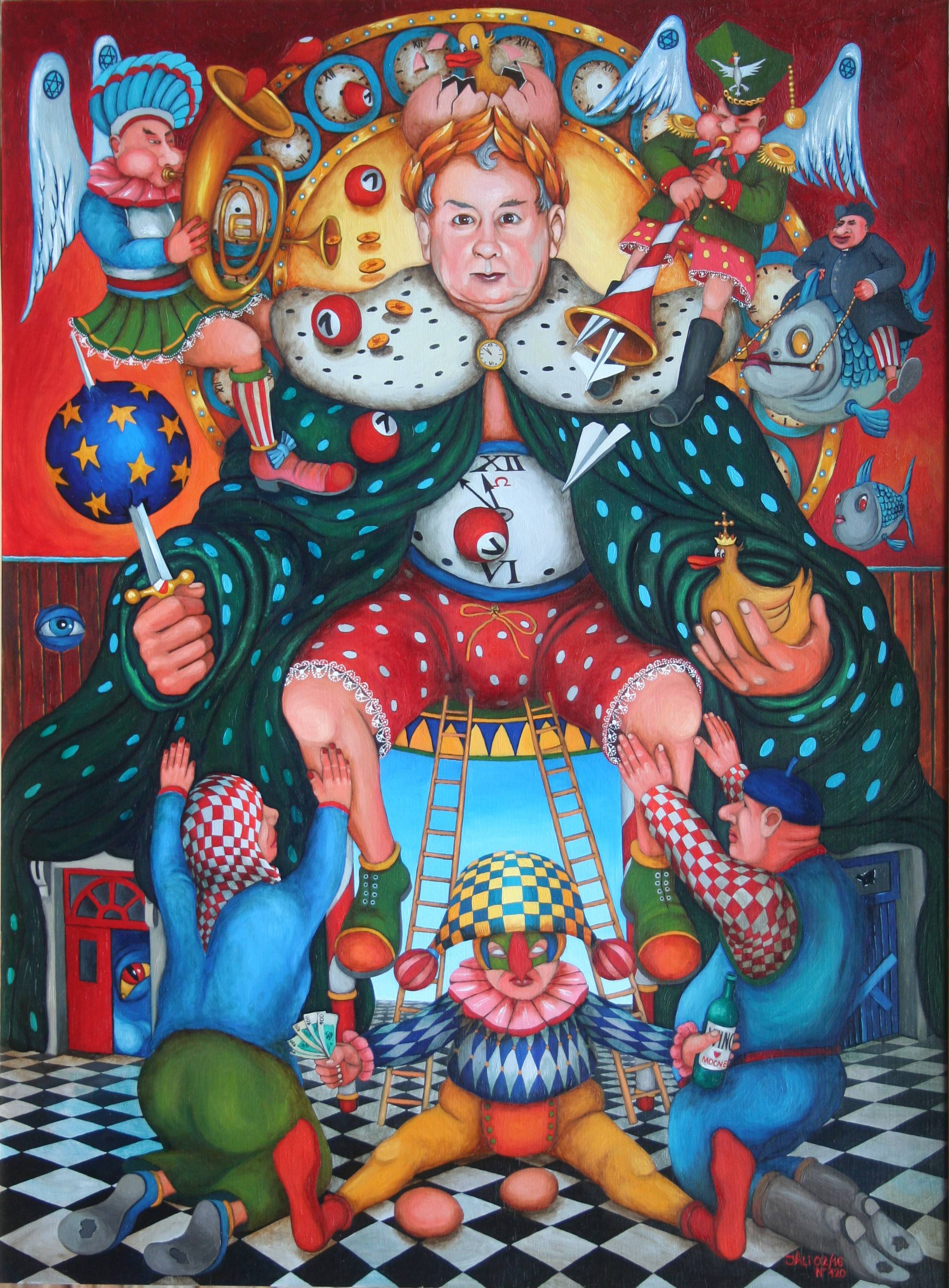 Obraz tętni życiem i kolorem, łącząc bogatą paletę barw. Na pierwszym planie dominuje postać ubrana w królewskie szaty, zdobiona wzorami jak z bajki. Otoczona jest przez dziwaczne postacie – harlekinów, aniołki z instrumentami i inne surrealistyczne postaci. Mocno nasycone kolory: czerwienie, błękity i złocienie, nadają obrazowi wyrazistego charakteru. Kompozycja chaotyczna może na pierwszy rzut oka, ale to ten chaos przyciąga wzrok i emanuje energią. Atmosfera obrazu to mieszanka humoru z pewną nutą ironii. Odbiorca czuje się jak w dziecięcej bajce, ale z przymrużeniem oka. Styl artysty przypomina surrealistyczny festiwal, gdzie każdy element tętni życiem. Smaczkiem jest sposób, w jaki artysta używa symboli – jakby ktoś próbował opowiedzieć historię z przeszłości. Obraz może budzić różne emocje – od rozbawienia po zdziwienie. "Za każdym razem widzę coś nowego!" – powiedziałoby 7-latka. Kontrast między realistycznymi a fantastycznymi elementami zmusza do refleksji o świecie, gdzie normy są umowne. Niezwykła ekspresja postaci przywołuje różne narracje – kto wie, czy nie jest to metafora współczesności. This painting is a true "eye-opener", zmuszając do przemyśleń z nutą zabawy.