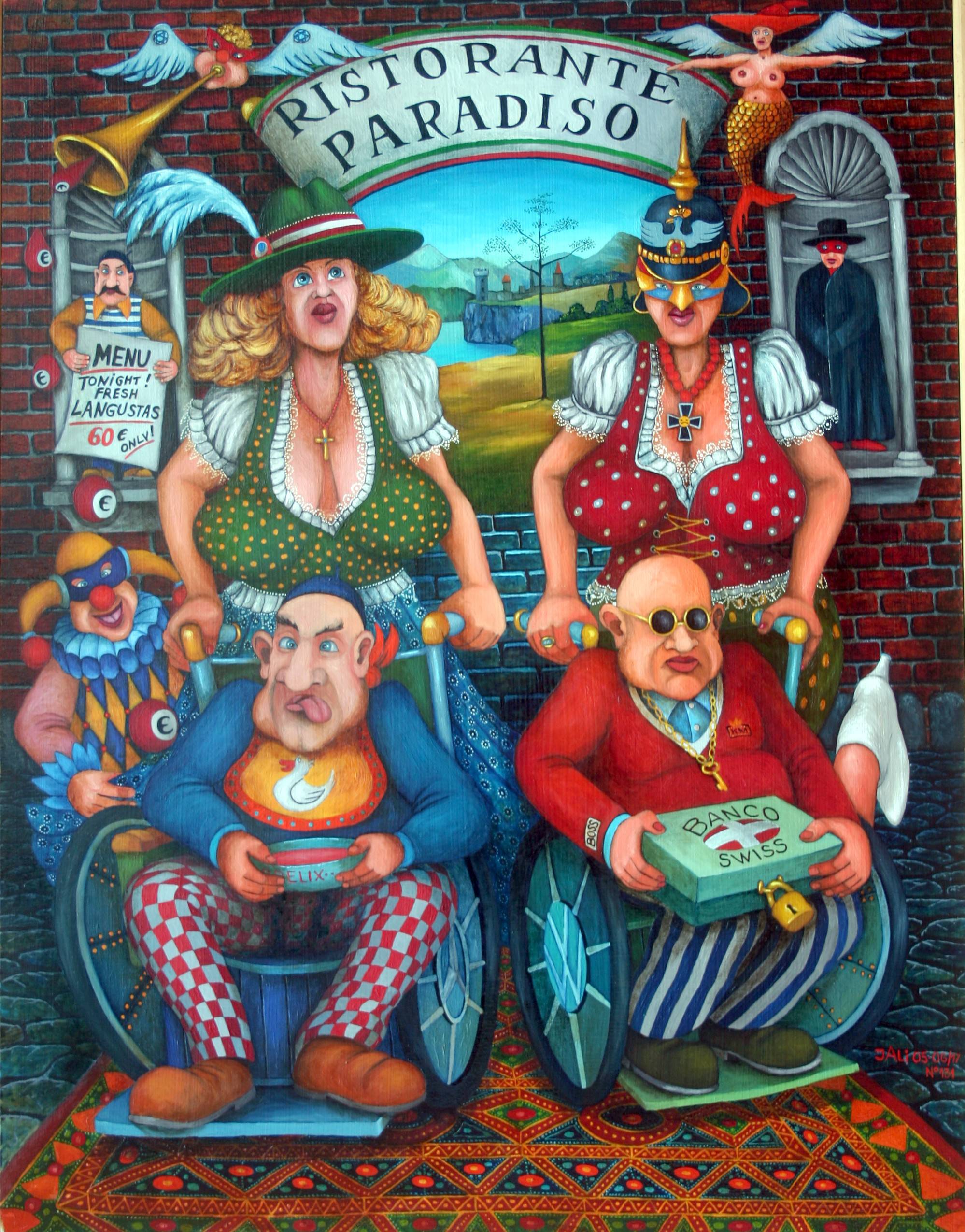Obraz przedstawia żywą scenę z restauracji pod nazwą "Ristorante Paradiso". Nasycone kolory, dominacja czerwieni, zieleni i niebieskiego przyciągają wzrok. Postacie wyglądają jak groteskowe kukiełki, z dużymi, niemalże karykaturalnymi twarzami. Kształty są przerysowane, co dodaje humorystycznego akcentu. W tle widać pejzaż jak z bajki, w zestawieniu z barokowymi detalami na postaciach. Obraz emanuje absurdalnym, komicznym nastrojem. Artysta korzysta z mieszanki technik, łącząc wyraziste kontury z bogatymi szczegółami. Cała scena tętni energią i wydaje się być zawadiackim żartem. Może wywołać u oglądającego zarówno uśmiech, jak i zdziwienie. Kompozycja jest chaotyczna, lecz celowo zgrana. Każda postać rozwija swoją własną historię. Wygląda to jak surrealistyczny maraton postaci, z których każda eksponuje swoje dziwactwo. People are crazy w tej restauracji. Tak jakby ktoś właśnie opowiedział śmieszną historię i wszyscy uczestniczą w teatralnym przedstawieniu. Czy to wszystko to parodia, czy może coś głębszego się za tym kryje? Może to symbolizuje wyśmiewanie świata konsumpcji? Jakie to zabawne, powiedziałoby dziecko. Styl jest niejednolity, co pozwala odbiorcy na własną interpratację. Sam czułem się jak widz na nietypowym przedstawieniu, gdzie granice rzeczywistości się zacierają.