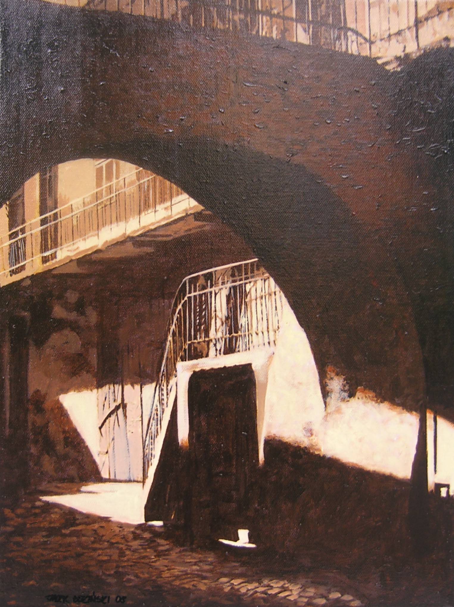 Na obrazie widzimy cichy zaułek, gdzie słońce wpada między mury, tworząc dynamiczne kontrasty światła i cienia. Dominują tu ciepłe brązy i beże, a łagodne linie schodów przecinają prostokątne bloki cieni. Kompozycja prowadzi wzrok ku górze, gdzie balustrady tworzą subtelny rytm. Nastrój jest nostalgiczny, niemalże melancholijny, przypomina o minionych chwilach w sennym miasteczku. Technika malarska jest pełna prostoty, ale też głębi – brushstrokes są miękkie, niemalże impresjonistyczne, a faktura płótna dodaje realizmu. Obraz budzi uczucia spokoju i zamyślenia, pozwalając na chwilę zatrzymać się w codziennym biegu. Dla mnie, osobiście, to jak powrót do dzieciństwa, do wakacji u babci, gdzie takie zaułki były idealnym miejscem na zabawę. It’s like you can almost hear the distant echo of footsteps. Dziecko powiedziałoby: "Wow, tam na pewno są skarby!". Czar tego obrazu tkwi w jego prostocie i umiejętności wywoływania emocji, jakby każdy zakamarek miał swoją tajemniczą historię do opowiedzenia.