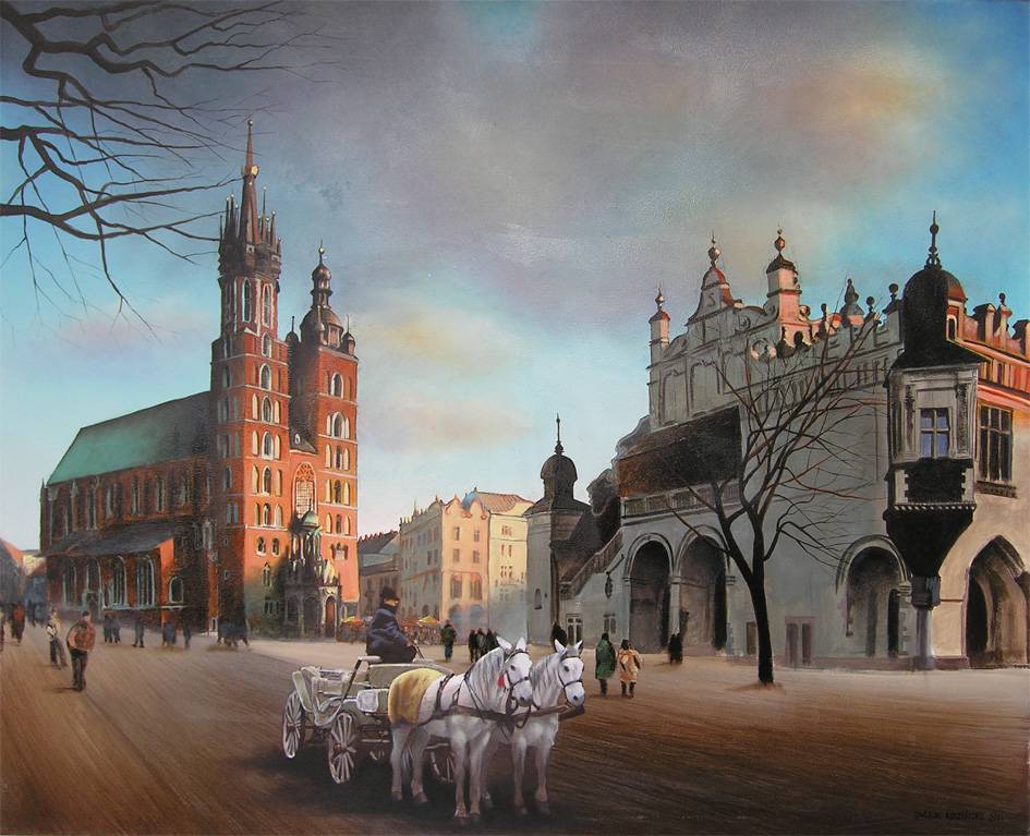 Obraz przedstawia malowniczy widok miejskiego rynku, pełen historycznego uroku. Barwy są stonowane, dominują ciepłe odcienie brązu i pomarańczu, które przechodzą w chłodne błękity nieba. Architektoniczne detale zachwycają precyzją – mamy tu eleganckie budynki, w tym charakterystyczne wieże kościoła i zabytkowe sukiennice. Na pierwszym planie widzimy elegancki powóz ciągnięty przez konie, nadający scenie nostalgiczny klimat. Atmosfera obrazu jest spokojna, wręcz idylliczna. Można niemal poczuć rześkie powietrze i usłyszeć stukot końskich kopyt. Artysta posłużył się realistycznym stylem, dbając o każdy szczegół i uchwycenie gry światła. Malarska technika łączy delikatne pociągnięcia pędzla z precyzyjnymi konturami, dając efekt subtelnego impresjonizmu. Obraz może budzić emocje związane z tęsknotą za dawnymi czasami. Czujemy ciepło i spokój, a także pewną melancholię za tradycyjnymi scenami z życia miasta. A wiesz, co by powiedział siedmiolatek? Patrzcie, jakie fajne koniki! Obraz inspiruje do refleksji nad historią i przemijającym czasem. W jego tonacji jest coś dreamlike, co sprawia, że chcemy się nim dłużej delektować. Właśnie takie dzieła przypominają, jak wiele uroku kryje się w codziennych chwilach.