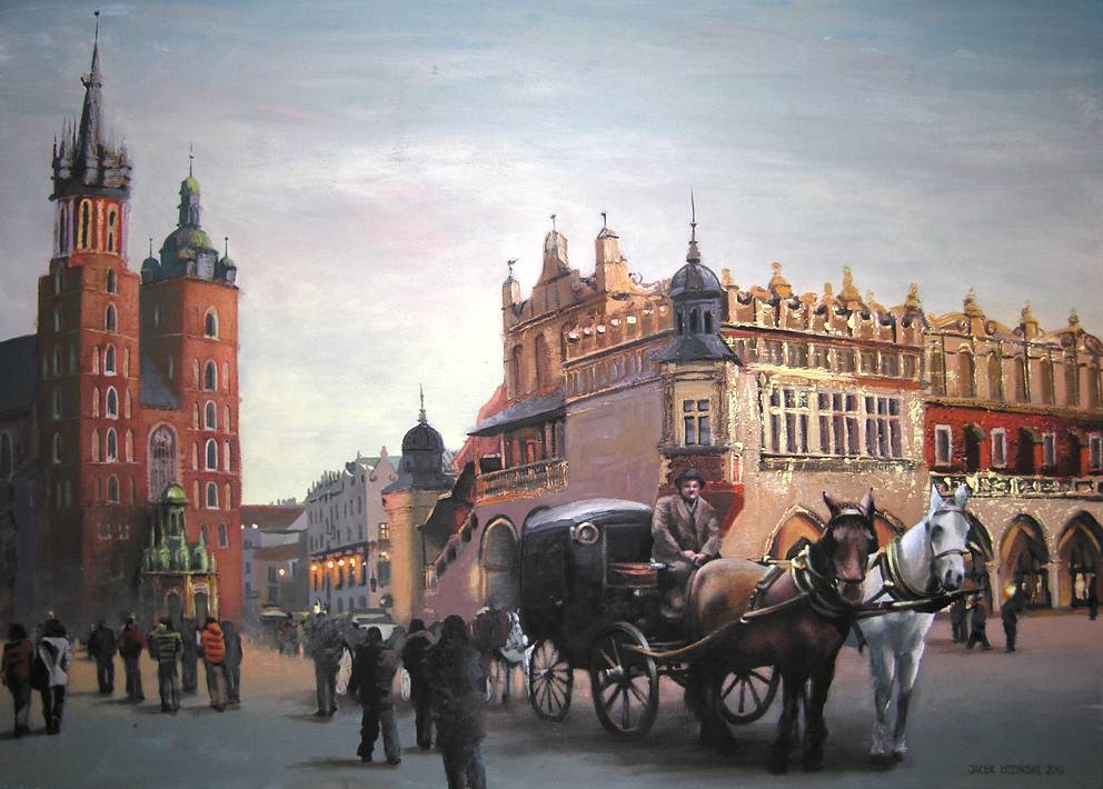 Ten obraz tętni życiem, uchwycając esencję krakowskiego Rynku Głównego w delikatnym blasku zachodzącego słońca. Dominują ciepłe odcienie złota i czerwieni, które kontrastują z łagodnymi błękitami nieba. Architektura Sukiennic i Kościoła Mariackiego jest szczegółowo przedstawiona, niemal jakby była częścią snu. Artysta zastosował technikę impresjonistyczną, łącząc miękkie pociągnięcia pędzla z realistycznym odwzorowaniem detali. Atmosfera obrazu jest przyjazna i nostalgiczna, przenosząc nas w czasie. Kolorowe sylwetki ludzi i koni przypominają nam o tętniącej życiem historii tego miejsca. Wow, koniki są naprawdę duże! Wzbudza to uczucia spokoju i zachwytu, ale jednocześnie tęsknoty za czasami, które minęły. Może to przypomnieć o prostocie minionych dni (good old days). Obraz emanuje ciepłem, prawie słychać stukot kopyt na bruku. Wciąga widza w swoją magiczną aurę, pozostawiając z uśmiechem na twarzy i myślą: "Może kiedyś tam wrócę".