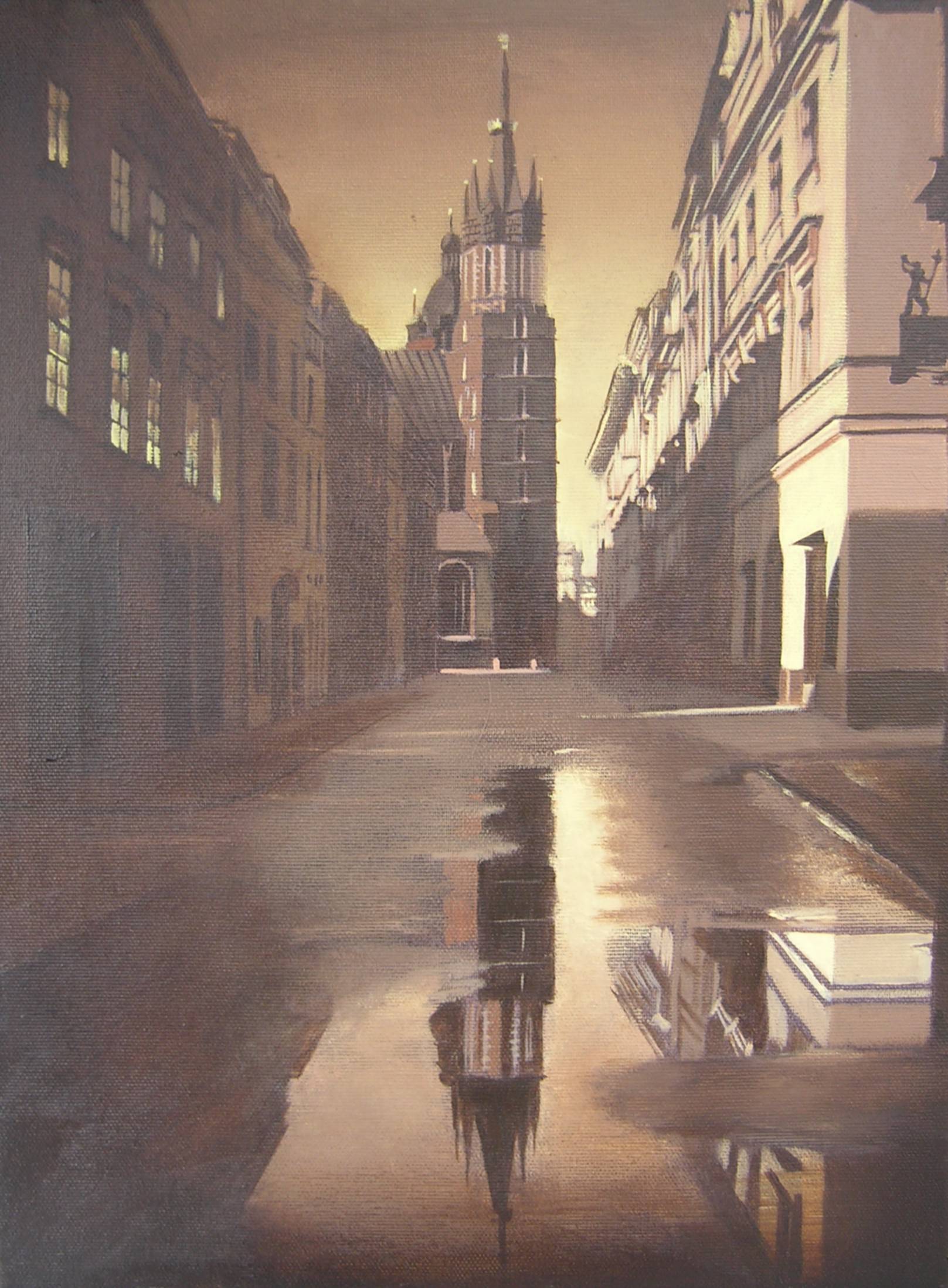 Obraz przedstawia urokliwą uliczkę w uśpionym mieście. Dominują ciepłe, ziemiste brązy i złote odcienie, które otulają budynki jak miękkim kocem. Na horyzoncie widnieje majestatyczna wieża, której kształt odbija się w nierównej kałuży, dając wrażenie nieskończoności. Kompozycja jest przemyślana, prowadząc wzrok widza w głąb ulicy, gdzie cienie tańczą na murach. Atmosfera obrazu jest pełna nostalgiczej zadumy. Czujesz, jakbyś znalazł się w miejscu z przeszłości, gdzie czas zatrzymał się na chwilę. Jest w tym coś magicznego i zarazem melancholijnego. Mood tego obrazu to idealne połączenie spokoju i tajemnicy. Artysta wykorzystał technikę olejną, co nadaje dziełu miękkość i głębię. Rozmyte kontury i subtelne przejścia kolorów tworzą efekt mgły, dodając aury tajemniczości. Wywołuje we mnie poczucie tęsknoty za dawnymi czasami. Patrząc na ten obraz, czuję, że mogłabym w nieskończoność wędrować tą ulicą. Wow, naprawdę kręci mi się w głowie od tej atmosfery. To miejsce zdaje się szeptać opowieści o miastowych sekretach. Czasem myślę, jakby to było wszystko tylko wymarzone marzenie.
