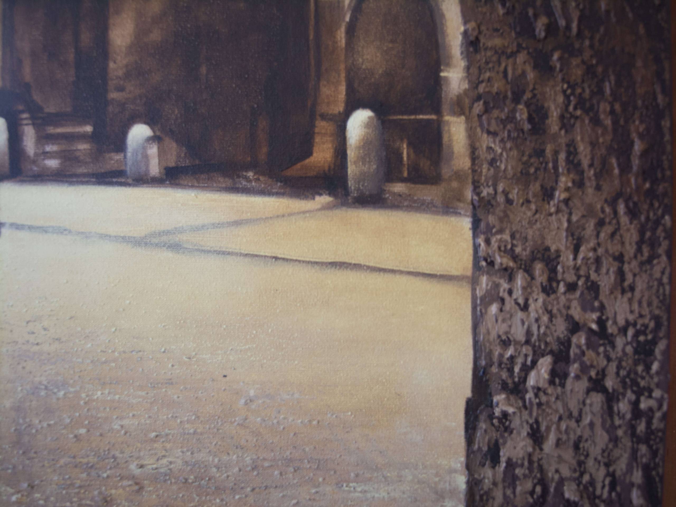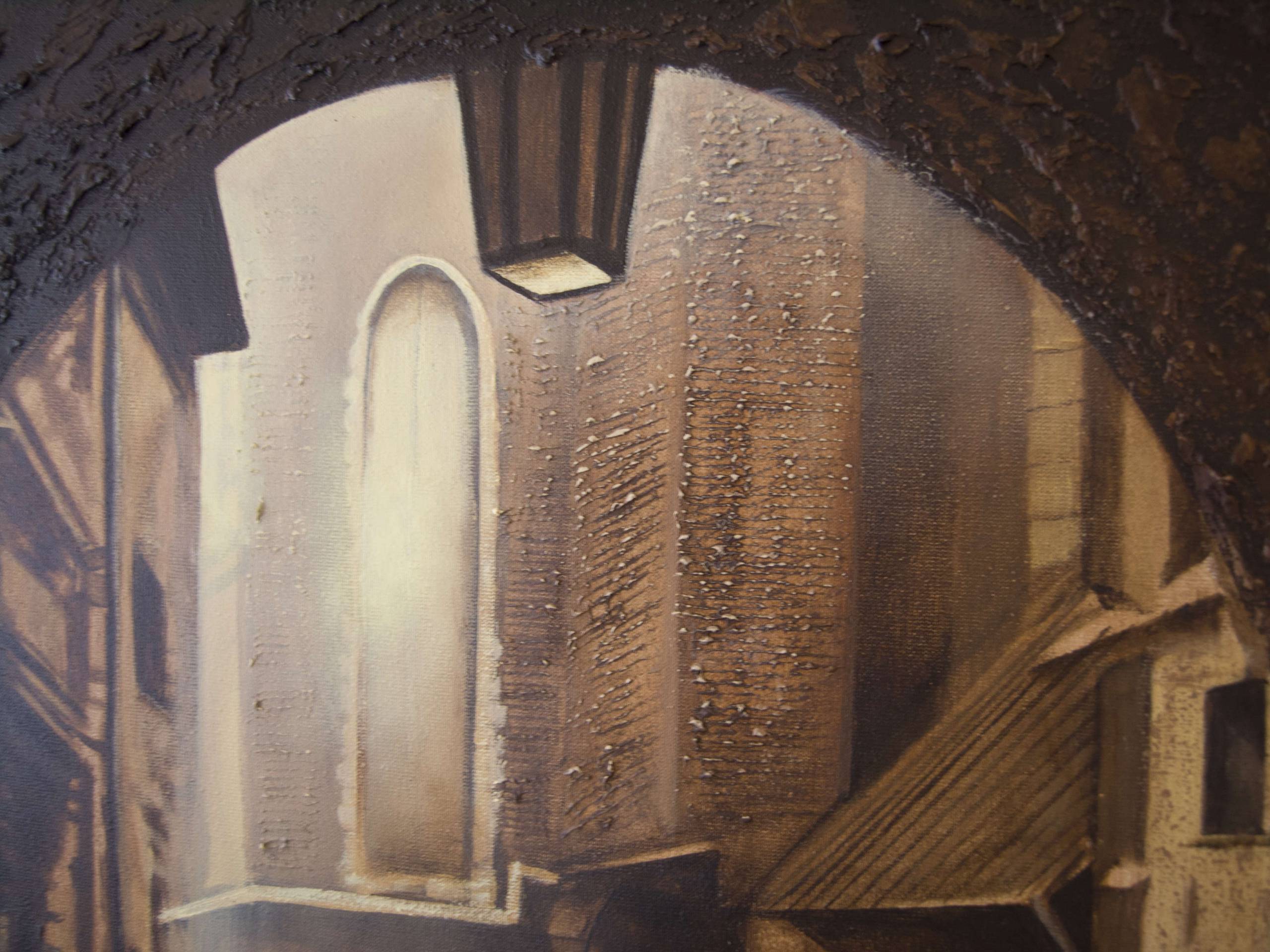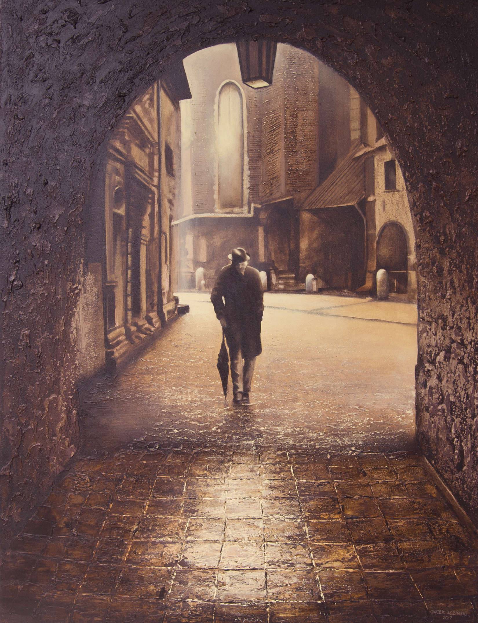 Trzeba przyznać, że obraz od razu przykuwa uwagę swoją klimatyczną aurą. Przedstawia mężczyznę kroczącego ciemnym przejściem, trzymającego parasol. Dominują tu barwy ziemi - ciepłe brązy i złote odcienie, które mieszają się z chłodniejszymi szarościami. Ulotne światło przebija się przez łukowate przejście, tworząc magiczny kontrast między cieniem a jasnością. Kompozycja emanuje spokojną atmosferą, ale jednocześnie ma w sobie nutę tajemniczości, jakby mężczyzna miał zaraz zniknąć w mglistym zaułku. Styl artysty przypomina technikę impresjonistyczną, ale z realistycznym twistem, co sprawia, że obraz jest jeszcze bardziej engaging. Faktura ścian i brukowanej ulicy jest niemal namacalna, jakby można było jej dotknąć. Artysta zastosował delikatne pociągnięcia pędzla, które dodają głębi i dynamiki tej statycznej scenie. Dla odbiorcy ten obraz może być pełen refleksji: nostalgia za dawnymi czasami czy delikatny smutek. Może mówić o poczuciu samotności w wielkim mieście, ale również o spokoju i wewnętrznej równowadze. "A ten pan to pewnie idzie do domu, bo pada deszcz", jak powiedziałby 7-latek, dodając swoje niewinne spojrzenie na świat. Osobiście czuję, jak obrazu dotyka mnie swoją ciepłą zimą. Jest w nim coś deeply melancholic, co sprawia, że zaczynam się zastanawiać nad dzielnicami, po których nigdy nie spacerowałem. Co tam się kryje za rogiem? Co to za historie, które zostają opowiedziane bez słów? To wszystko sprawia, że obrazu chce się oglądać i oglądać, z nadzieją na odnalezienie ukrytych szczegółów.
