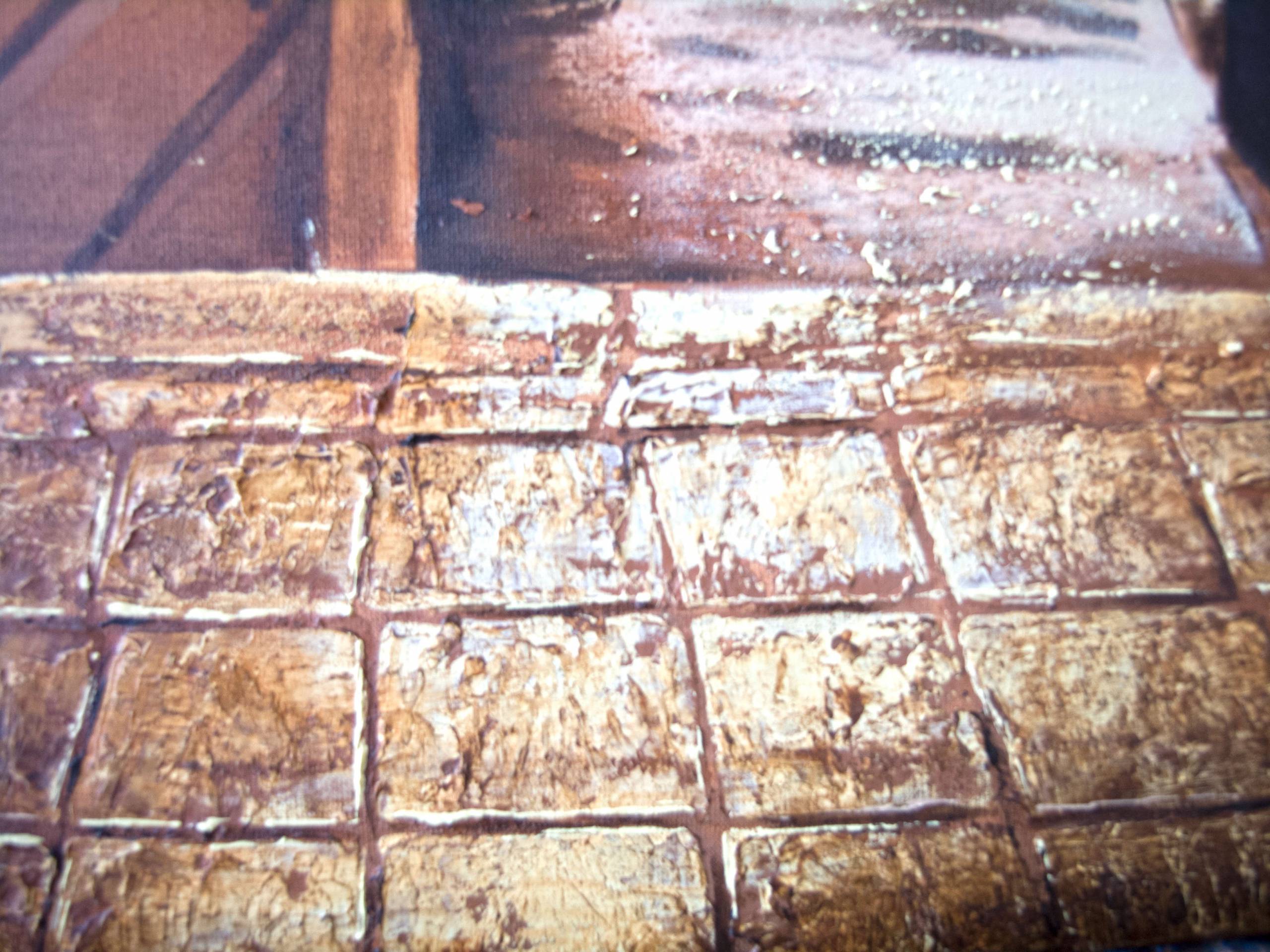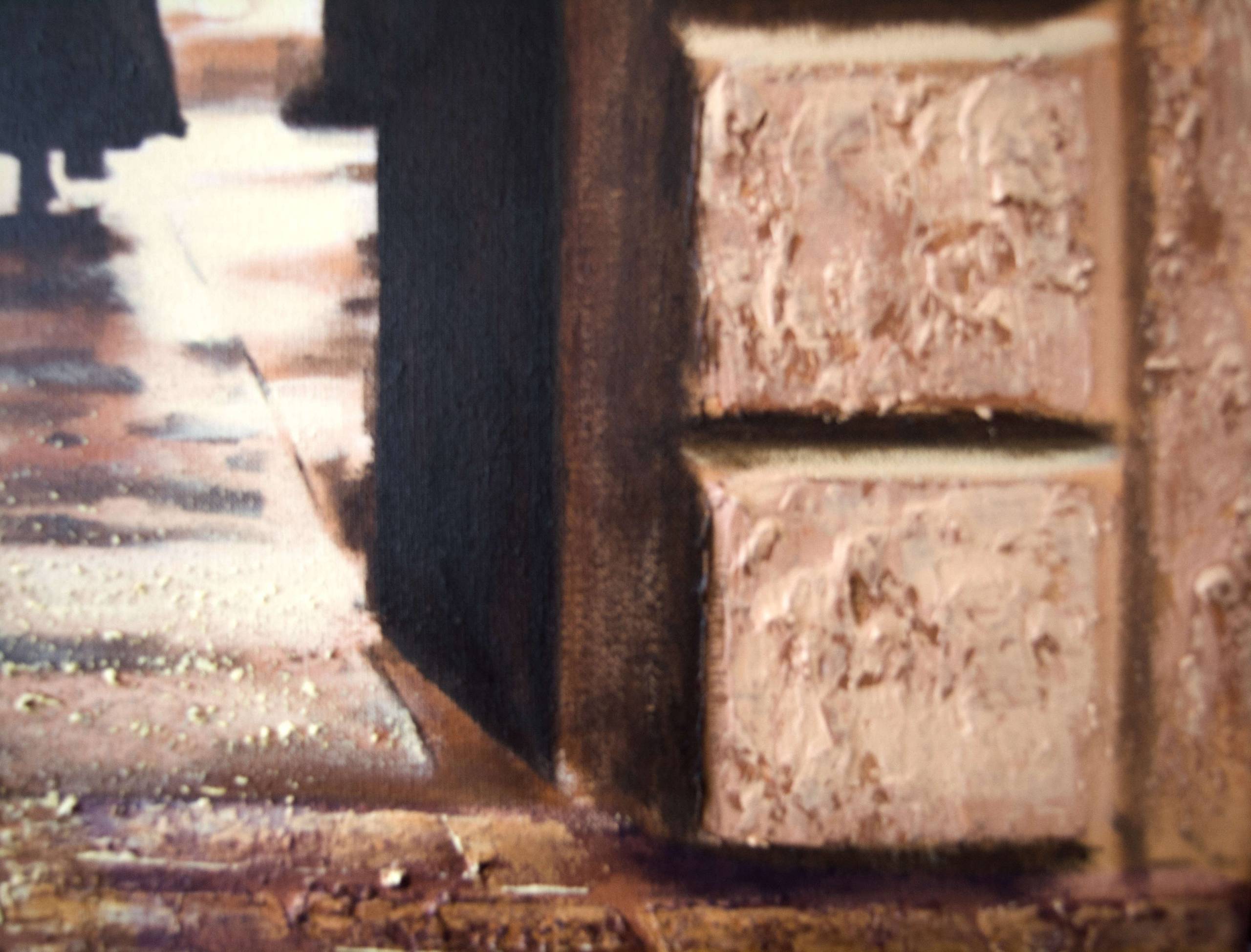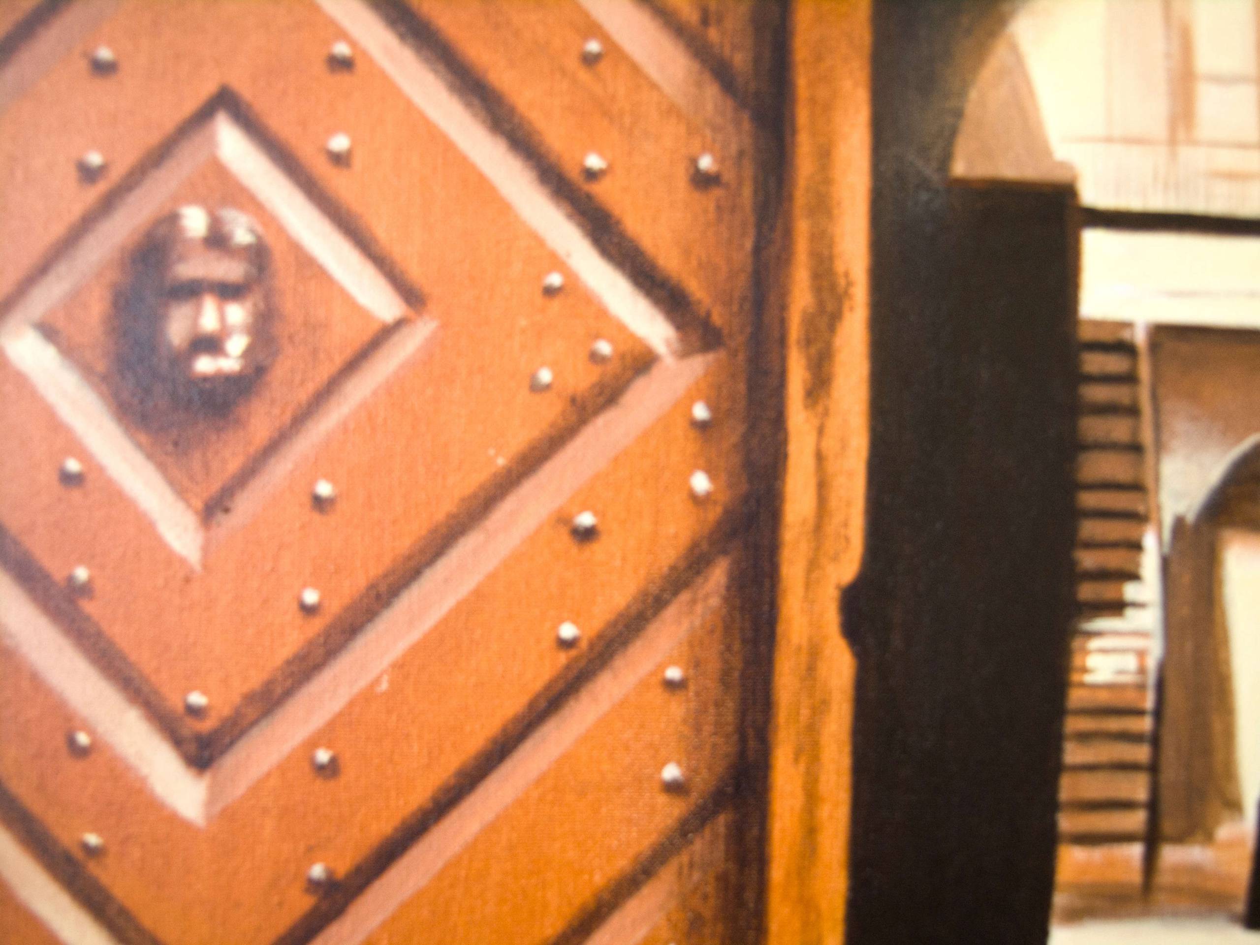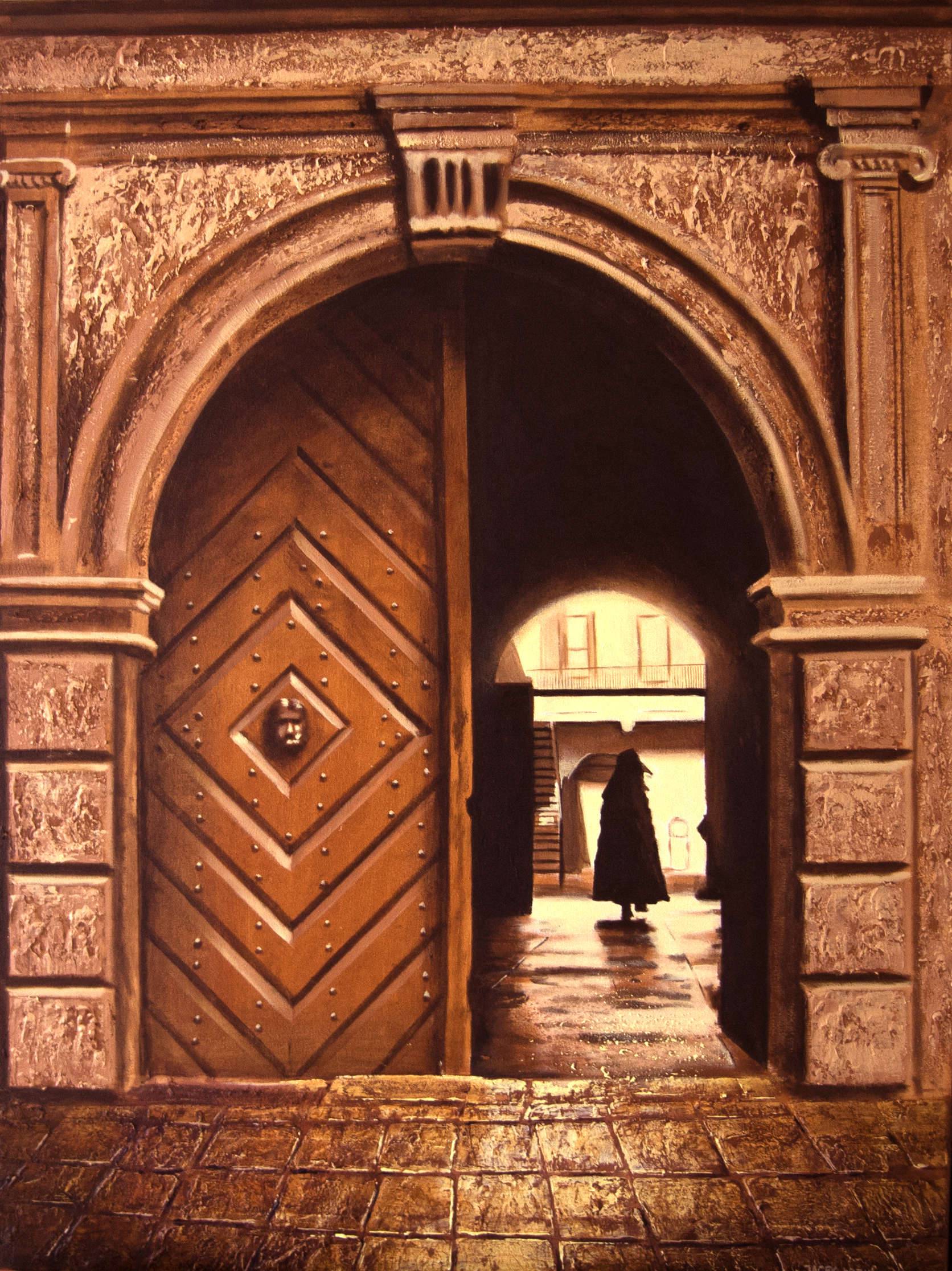 Na obrazie dominują ciepłe odcienie brązu, tworząc uspokajającą, niemal mistyczną atmosferę przepełnioną nostalgią. Monumentalne drzwi ozdobione są geometrycznymi wzorami i misternymi detalami, które przyciągają wzrok niczym magnes. Głębokie cienie kładą się na ścianach kamiennego wejścia, potęgując poczucie tajemniczości. Postać, ubrana w ciemny płaszcz, przechodzi przez drzwi, co dodaje scenie dynamizmu i unikalnej narracji. Może to być ktoś z bajki! Wykorzystanie światłocienia i kontrastów sprawia, że przestrzeń zdaje się pulsować własnym, nieuchwytnym życiem. Tak, jakby kusiła, by przekroczył próg i odkryć, co kryje się dalej. Technika malarska wskazuje na precyzyjne pociągnięcia pędzla, które tworzą iluzję trójwymiarowości i głębi. Patrząc na to, serce odczuwa pewien melanż tęsknoty i fascynacji - a może to właśnie jest magia art? Obraz prowokuje do refleksji nad przeszłością i przyszłością, nad nieznanym, które czeka za zamkniętym drzwiami.