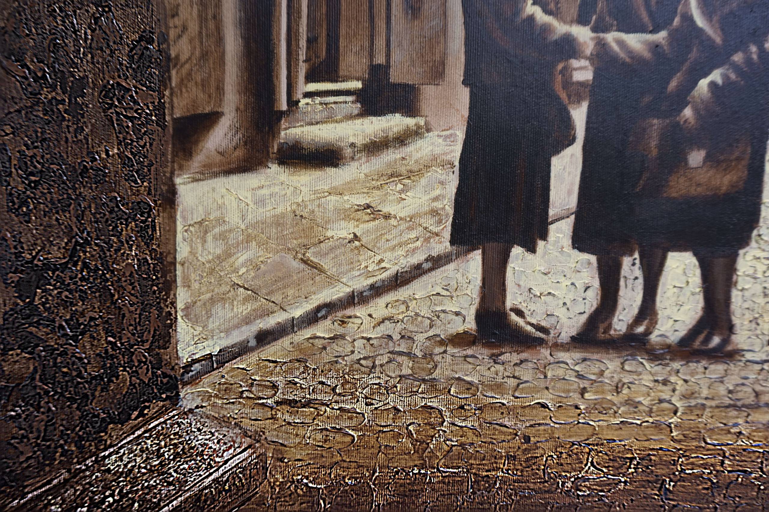 Na tym obrazie dominują ciepłe odcienie brązu i beżu, które tworzą nostalgiczną atmosferę uliczki z minionych lat. Kamienisty bruk jest oświetlony miękkim światłem latarni, które dodaje urokliwego, niemal magicznego charakteru. Przestrzeń zapełniają zadaszone balkony i afisze reklamowe, przypominające staromodne szyldy sklepowe. Trzy kobiety w pelerynach, z gracją zatrzymane w ruchu, stoją na ulicy, prowadząc rozmowę. Obok nich stoi chłopiec, patrzący z ciekawością na tajemniczą scenę. Technika używana przez artystę zdaje się łączyć klasyczne podejście z odrobiną impresjonizmu. Nastrój jest ciepły, wręcz intymny, jakby widz podglądał jeden z wielu codziennych momentów przeszłości. Może trochę spooky, ze względu na zjawię przy wyjściu z bramy, ale to właśnie budzi wyobraźnię. Krytykując, nieco niechlujne pociągnięcia pędzla w tle sprawiają, że całość wydaje się bardziej dynamiczna i żywa. Możemy interpretować tę scenę jako spotkanie przyjaciółek, moment wspólnoty i wymiany plotek. Dla mnie to jak podróż w czasie. Ten obraz sprawia, że czuję się ciepło i odrobinę melancholijnie, przypomina mi opowieści babci. Londyn w popołudniowym świetle. Jakby ktoś wziął kawałek przeszłości, zakonserwował w farbie i podał na platynowej tacy. Mówię Ci, dzieciak miałby frajdę.