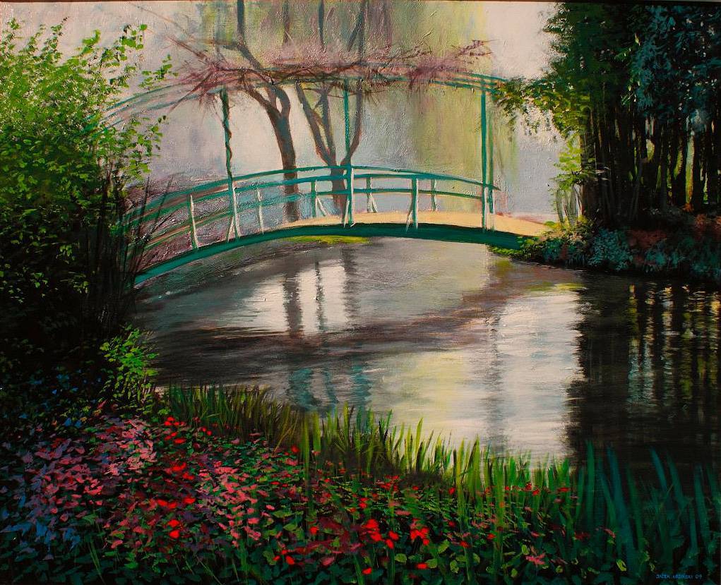 Obraz ukazuje spokojny ogród z malowniczym mostkiem rozpostartym nad spokojną taflą wody. Dominuje bogaty zestaw odcieni zieleni – od delikatnych pastelowych tonów drzew po intensywnie zielone liście. Mostek, w subtelnym kolorze jasnego turkusu, idealnie wpisuje się w całość kompozycji, tworząc harmonijną scenę. Jego odbicie w wodzie dodaje wrażenia głębi i spokoju. Atmosfera obrazu to typowy chillout, jakby czas się zatrzymał, a jedynym dźwiękiem były szelesty liści i cichy szmer wody. Malarz zastosował technikę impasto, co nadaje fakturze liści i wody trójwymiarowości. Styl obrazu przywodzi na myśl impresjonizm. Kolory są soczyste, a pociągnięcia pędzla pełne światła. Patrząc na to, czuję ukojenie i spokój, niemal słychać echo kroków na mostku. Dziecko mogłoby powiedzieć: "Chciałbym tam zagrać w berka!" Ten obraz to także nostalgia za chwilami spędzonymi na łonie natury, kiedy wszystko jest beautiful i bez zmartwień. To miejsce wydaje się idealne na medytację czy chwilę refleksji, pozwalając zanurzyć się w marzeniach.