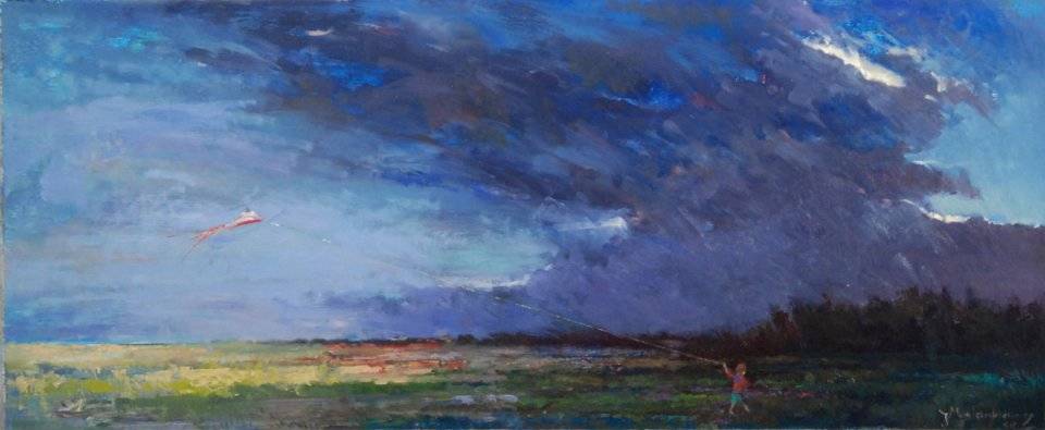 Na obrazie dominują intensywne kolory nieba, które płynnie przechodzą od głębokiego błękitu po ciemniejsze, niemalże burzowe granaty. Poszczególne odcienie układają się jak w kalejdoskopie, tworząc dynamiczną kompozycję. Krajobraz poniżej wypełniają zielone łąki, które dodają harmonii tej malowniczej scenerii. Gdzieś po lewej unosi się kolorowy latawiec, stanowiący kontrast dla ciemniejącego nieba. Obraz emanuje atmosferą tajemnicy i nieprzewidywalności, jakby nadciągała burza, jednocześnie zapraszając do marzeń. Styl artystyczny można określić jako impresjonistyczny, z wyraźnymi pociągnięciami pędzla, które dodają energii. Niczym dziecko, które biega z latawcem, czuje się ten obraz. To takie fajne! Całość wywołuje nostalgię za beztroskimi dniami, kiedy jedynym zmartwieniem było to, czy latawiec uniesie się w powietrze. Ten painting przyciąga uwagę i skłania do refleksji nad pięknem chwili zatrzymanej w czasie. Malarskie techniki, takie jak kontrast kolorów i dynamiczna faktura, sprawiają, że czujemy się częścią tego świata. Obraz może poruszyć każdego, kto pozwoli sobie na chwilę dziecinnej radości oraz zanurzenie w emocjach, które wydają się tak bliskie i prawdziwe. To arcydzieło mówi wprost do duszy, będąc jednocześnie pejzażem i wspomnieniem.