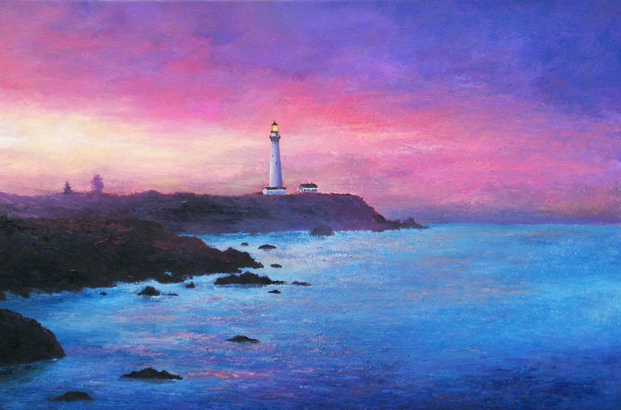 Na tym obrazie mamy przed sobą malowniczą scenę, która zachwyca swoją paletą kolorów. Różowawe i fioletowe niebo płynnie przechodzi w błękit morza, tworząc harmonijną kompozycję. Światło latarni morskiej oświetla krajobraz, dodając mu magicznego blasku. Wzrok przyciąga wysoki, jasny budynek na horyzoncie, który stoi dumnie, jakby mówił „tu jestem”. Całość emanuje spokojem wieczoru. Atmosfera przypomina senne marzenie, kiedy wszystko wydaje się możliwe. Artysta zastosował technikę impastu, z delikatnymi pociągnięciami pędzla. Dzięki temu struktura obrazu jest bogata i pełna głębi. Obraz wywołuje poczucie tęsknoty za nieznanym, odkryciem czegoś nowego. Czuję, że latarnia mów mi: "Hej, nie bój się marzyć". W tle słychać szum fal, a powietrze jest jakby nasycone solą. Wow, czy to nie jest piękne? To miejsce, gdzie dzieciak mógłby biegać i się cieszyć. Obraz jest cudownym przykładem zjawiska "serenity", które każdy z nas czasem potrzebuje. Taki widok może sprawić, że zapomnimy o codziennych troskach, a nasze serce wypełni się spokojem i nadzieją. To prawdziwy balsam dla duszy.