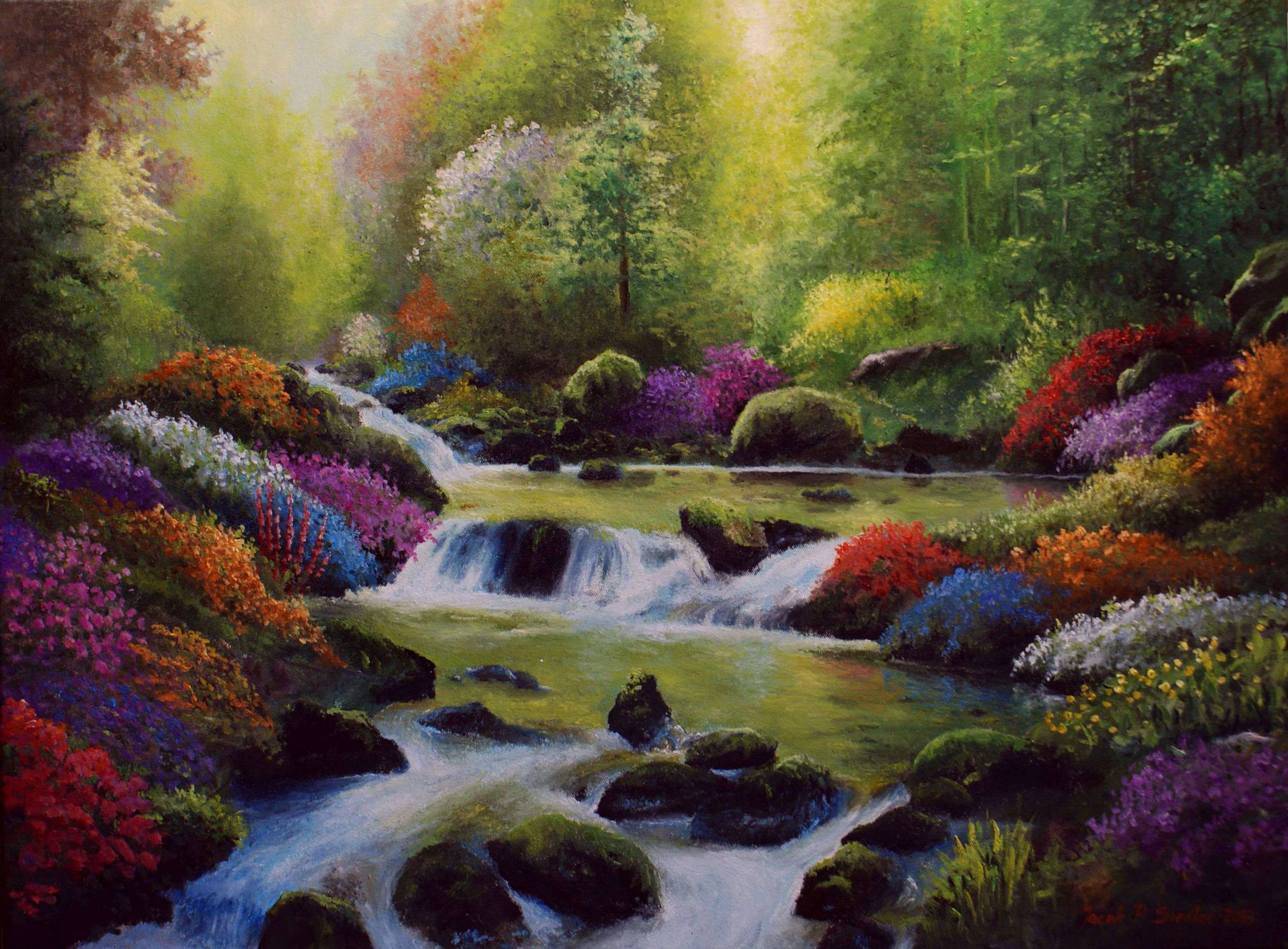 Na tym obrazie widać prawdziwą eksplozję kolorów. Zieleń drzew otula spokojny potok, którego lekko spieniona woda szmera cicho pośród kamieni. Ale to te wszystkie kwiaty, które jakby wylewają się z każdej strony, są prawdziwymi gwiazdami tego przedstawienia. Fiolet, czerwień, pomarańcz i niebieski tańczą ze sobą w harmonii, tworząc tęczowy dywan. Obraz emanuje spokojem i przyjazną atmosferą, jakby zapraszał do chwili zadumy. Czuć, że artysta zastosował delikatne pociągnięcia pędzla, aby oddać miękkość przyrody. Styl jest nieco impresjonistyczny, ale z domieszką realizmu. Można odnieść wrażenie, że woda naprawdę płynie, a kwiaty pachną. Dzieciak powiedziałby: "To wygląda jak raj!". Obraźe wywołuje w mnie wewnętrzny spokój, a zarazem radość z tego spotkania z naturą. Ta sceneria jest jak z opowieści, almost magical. Laik powiedziałby, że to po prostu śliczny kawałek sztuki, ale każdy znajdzie tutaj coś dla siebie.