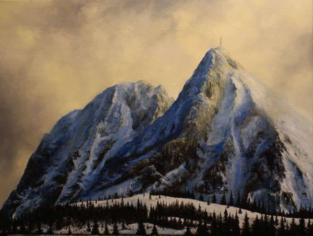 Na tym obrazie dominuje majestatyczny szczyt górski, który wznosi się dumnie ku niebu. Góra pokryta jest delikatnym płaszczem śniegu, które połyskuje w przytłumionym świetle. Odcienie błękitu przeplatają się z szarościami, tworząc efekt dramatycznego kontrastu. Chmury unoszące się w tle dodają tajemniczości i nadają nieco mrocznego nastroju. Kompozycja obrazu jest zdumiewająca, prowadząc wzrok ku samej górze, jakbyśmy mieli ochotę wdrapać się na jej szczyt. Atmosfera tego dzieła emanuje ciszą i spokojem, ale też poczuciem wielkości natury. Czujesz, jakbyś nagle stanął pośród tych gór, z dala od zgiełku codzienności. Artysta zastosował technikę impasto, co dodaje tekstury i głębi. Pociągnięcia pędzlem są wyraziste, a jednocześnie pełne delikatności, co sprawia, że obraz wydaje się niemal dotykalny. Patrząc na to dzieło, można poczuć zarówno podziw, jak i onieśmielenie wobec potęgi natury. "O wow, ale duża góra!" - powiedziałby 7-latek. Każdy kto patrzy na to dzieło, może odczuwać różnorodne emocje, od spokoju po zachwyt. W obraz wplecione są uczucia, które potrafią poruszyć duszę. Jeden rzut oka wystarczy, by poczuć się "uplifted" i zanurzyć się w tej górskiej opowieści.
