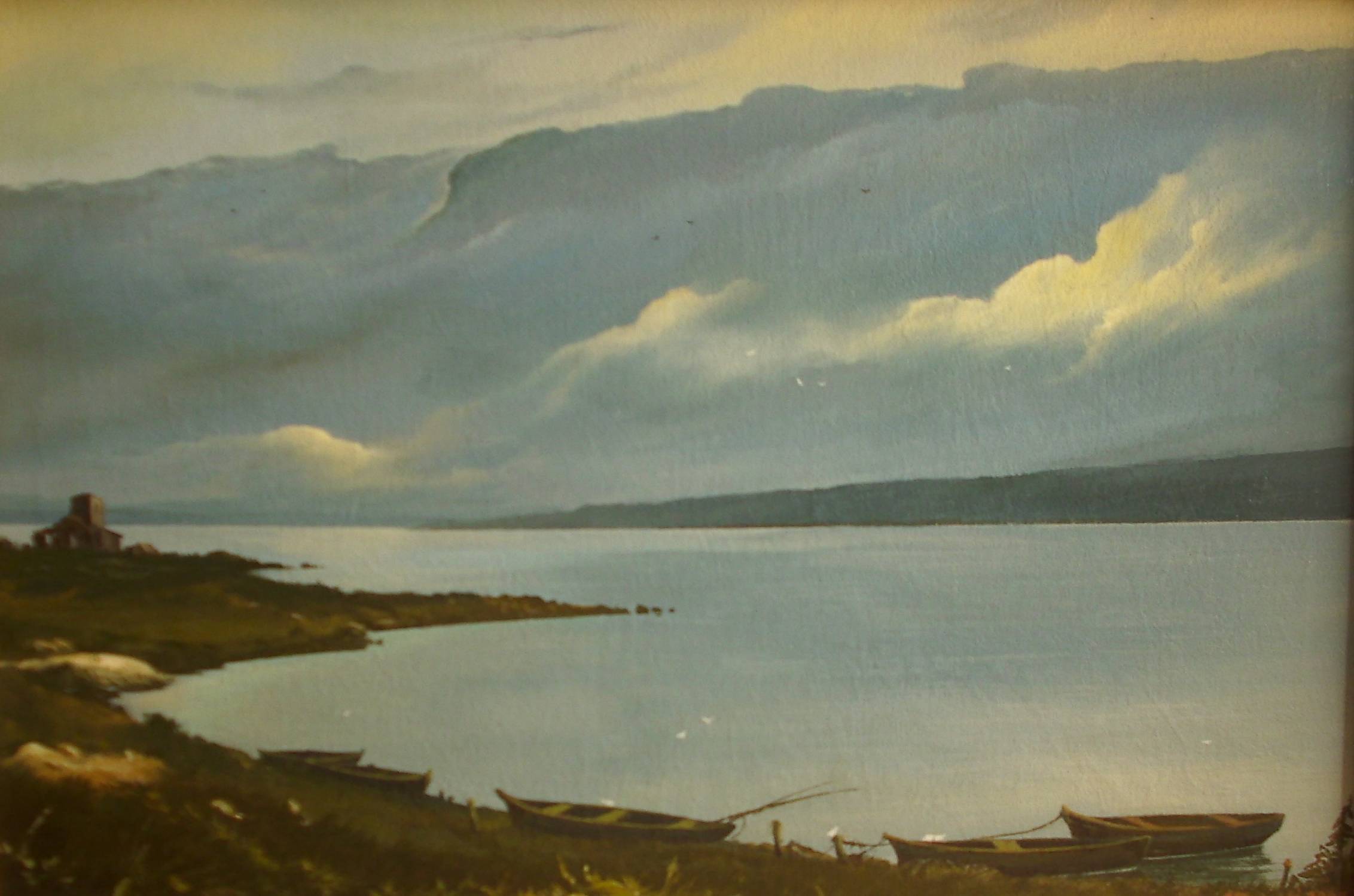Na obrazie widzimy spokojny krajobraz nad jeziorem. W centralnej części kompozycji woda delikatnie odbija niebo zasnute grubymi chmurami, które dominują nad całym pejzażem. Kolory są stonowane, z przewagą zieleni i odcieni niebiesko-szarych, które nadają całości melancholijny nastrój. Łodzie przy brzegu wydają się być pozostawione przez rybaków, tworząc wrażenie opuszczenia i ciszy. W oddali widać niewielką chatkę, co dodaje scenie tajemniczości. Atmosfera tego miejsca jest magiczna, trochę jak z bajki, w której wszystko zatrzymało się na chwilę. Artysta użył delikatnych pociągnięć pędzla, co nadaje obrazowi eterycznego charakteru i sprawia, że widz niemal czuje powiew wiatru nad wodą. To miejsce wygląda, jakby czas stanął w miejscu. Można się tu naprawdę zgubić w myślach. Obraz może budzić różne emocje - od spokoju i refleksji po pewien smutek, bo coś się skończyło. To trochę tak jak „peaceful moment”, który każdy chciałby zachować na długo. Wygląda, jakby zaraz miało zacząć padać, ale tylko troszkę, takie delikatne krople. Mam ochotę usiąść na brzegu i zastanowić się nad sensem życia lub po prostu posłuchać ciszy.